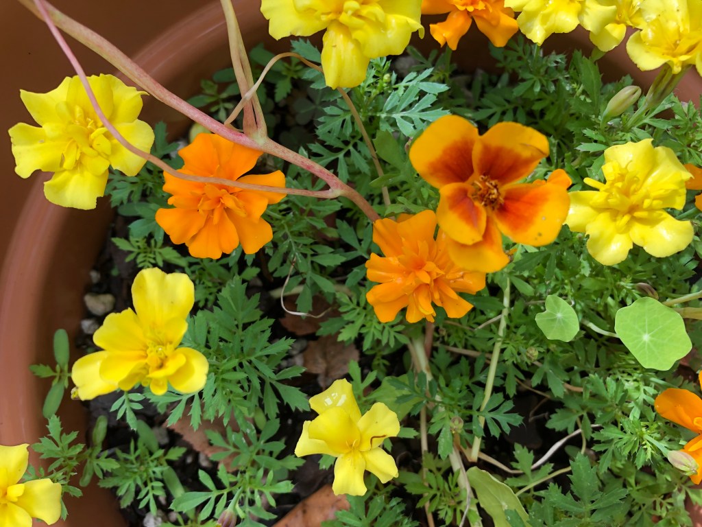 We tend to think of autumn colours as being golden yellows, deep oranges and soft browns…almost like the miniature marigolds (and yes that is a sneaky little nasturtium) below, that are making me smile at the moment.