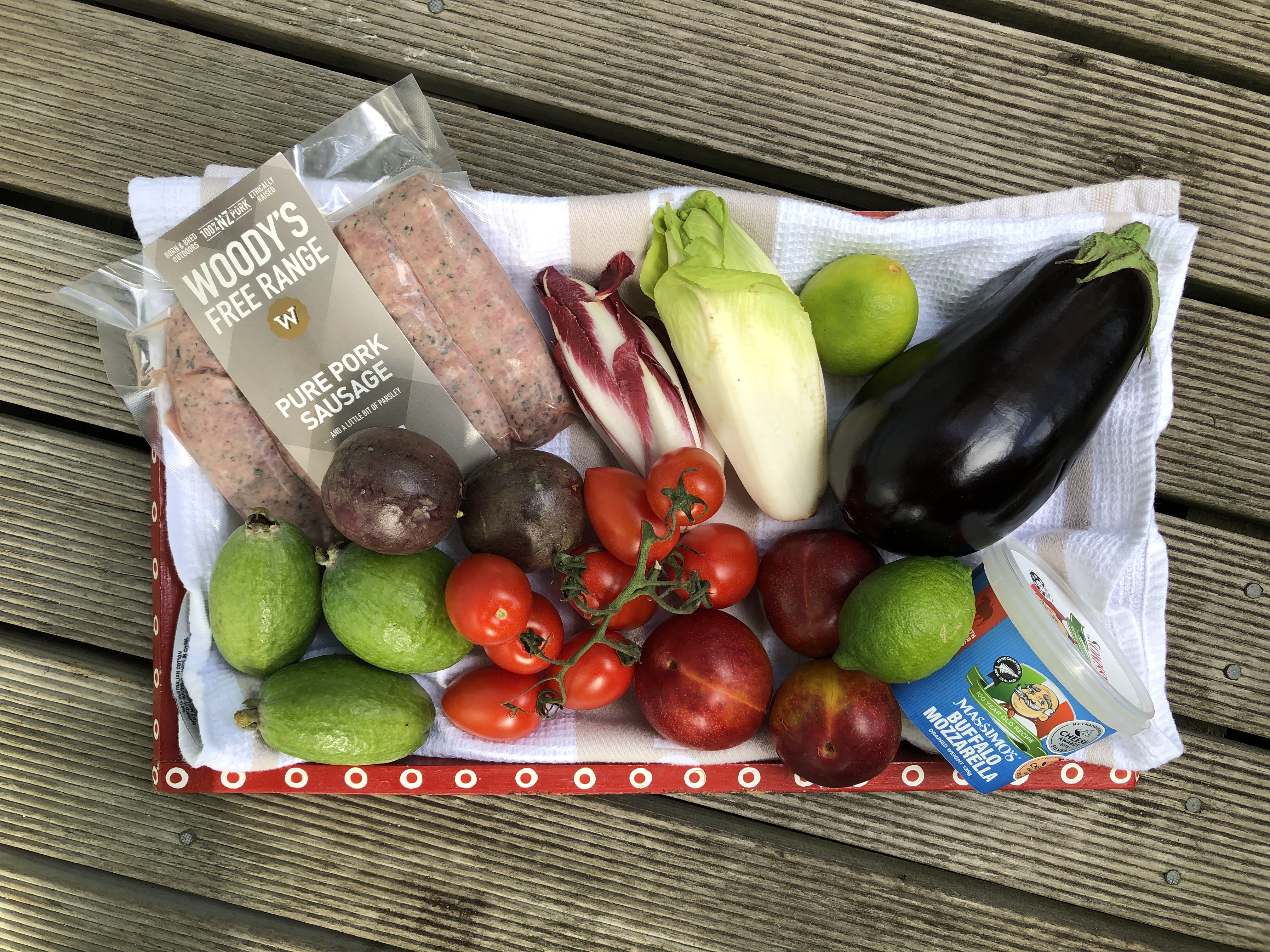 And so to food….I picked up some more scallopini or patty pan squash, along with some yellow beans, collard greens, red chard and cavolo nero on Wednesday, because everything looked so bright and fresh. Some of the things in the shopping basket this week included sausages, witloof (or chicory) to make a salad with pears and walnuts perhaps, limes, a tub of mozzarella, aubergine (a current favourite), plums, tomatoes, passion fruit and that seasonal fruit that people go mad for in New Zealand, feijoas.