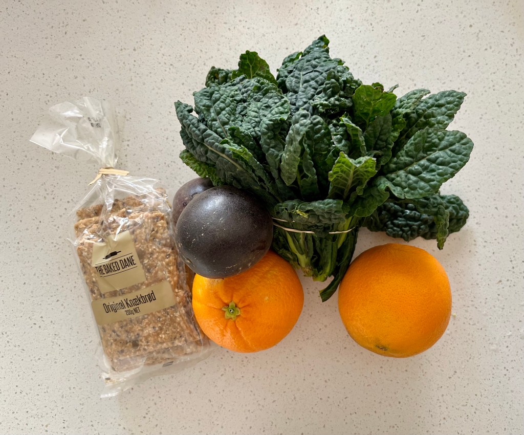 On Wednesday I picked up a bunch of cavolo nero (half of which went into Wednesday’s pea soup, the other half into Sunday’s dinner), a couple of oranges and passion fruit, eggs, a packet of the lovely crackers from The Baked Dane, and some turkey mince. We went food shopping on Sunday, and picked up chickpeas, chicken mince, satsumas, kiwi fruit, two more passion fruit, a bunch or purple sprouting broccoli and a few other bits and pieces such as cheese.