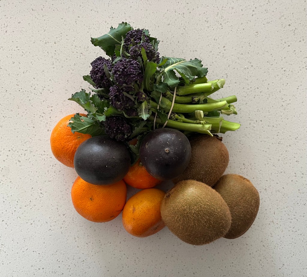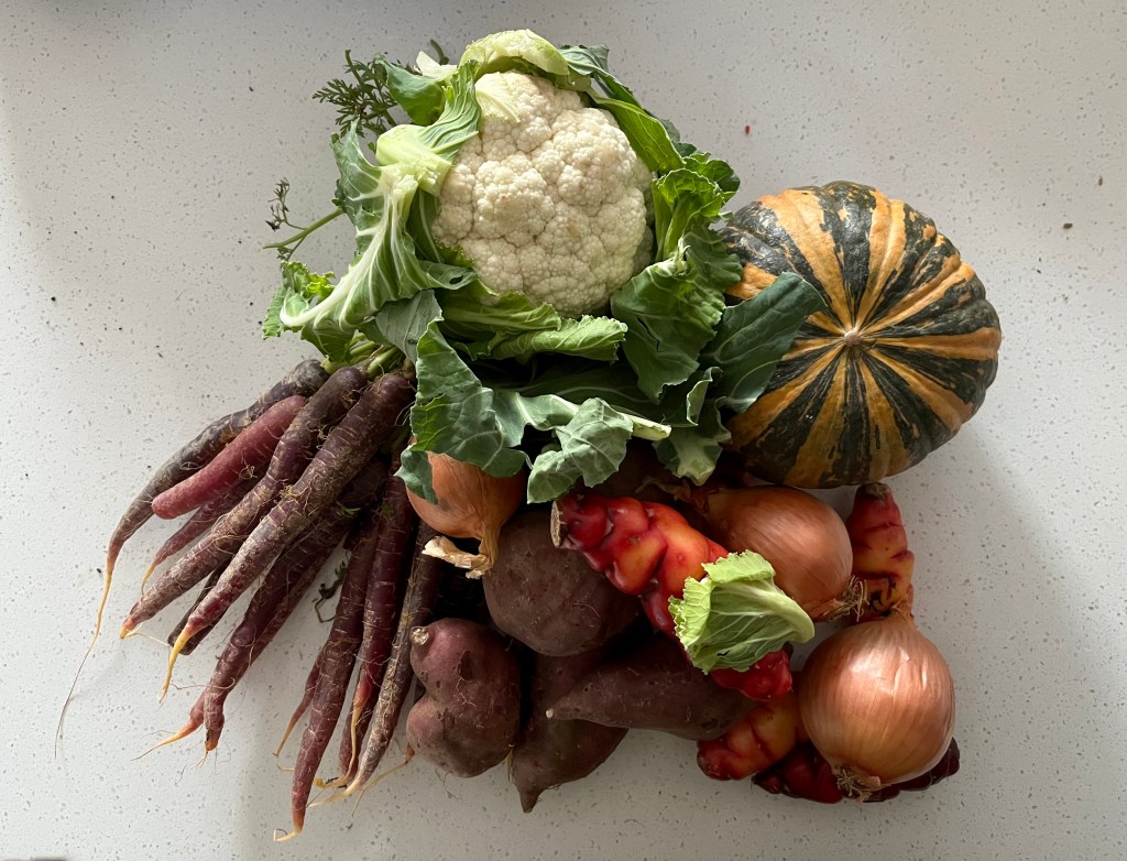 It was back to a Wonky Box delivery this week, and there was another pumpkin (but isn’t it beautiful with those perfect stripes?), a small cauliflower that I cooked on Friday, with leftovers on Saturday, a bunch of purple miniature carrots, onions, yam (oca), kumara and – not shown – a lettuce and little bag of purple Brussels sprouts.