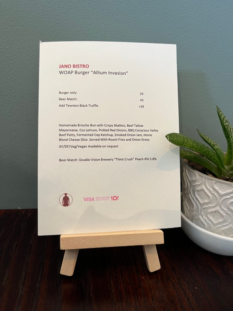 As I mentioned last week, Wellington on a Plate is on right now, and part of this month long celebration of food is Burger Wellington, with a competition to find the most inventive and delicious burger. These can be classic beef, lamb, chicken, vegetarian, vegan or even sweet. For lunch on Wednesday I sampled the one at Glou Glou, the California Dreamin’, a vegetarian offering with a roasted beetroot, black turtle bean and chickpea patty served with tobacco onions, pickled Roma tomato, microgreens, iceberg lettuce and Green Goddess dressing in a Food Envy suprême croissant. The beer pairing was Mouth Party Hazy IPA from Double Vision Brewing Company. This tasted great, though the patty itself was a little crumbly. All in all though, a great creation.
