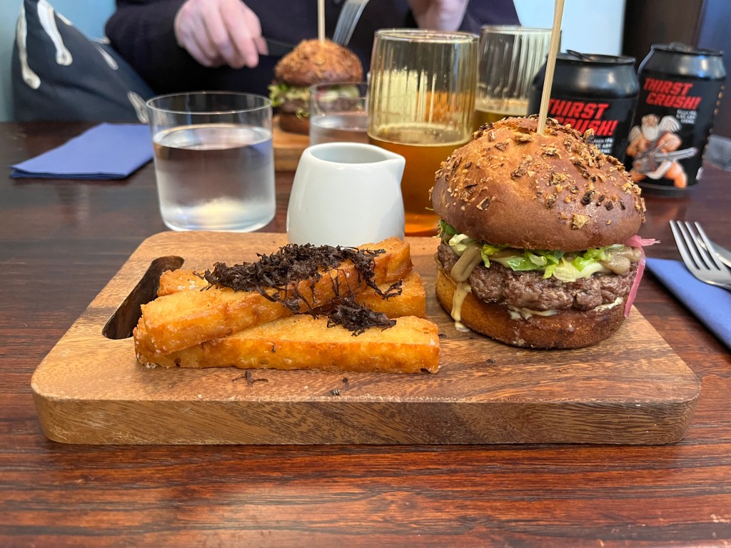 For Saturday lunch, we headed to Jano Bistro, we last visited for my birthday. Their burger was inspired by French onion soup, and was probably the best burger I have ever had. This was a Conscious Valley BBQ brisket and rib beef patty with smoked onion jam, cheese blend slice, cos lettuce, pickled onions, Conscious Valley beef tallow mayonnaise and foraged and fermented cep mushroom ketchup in a housemade crispy shallot milk brioche bun, with rösti fries and onion gravy glaze, and I also opted for the black truffle shaved over the chips/fries. The flavours were unbelievable, everything perfectly cooked and beautifully presented. The beer pairing, Thirst Crush (Peach IPA) from Double Vision Brewing was an excellent match. We both voted 10/10.