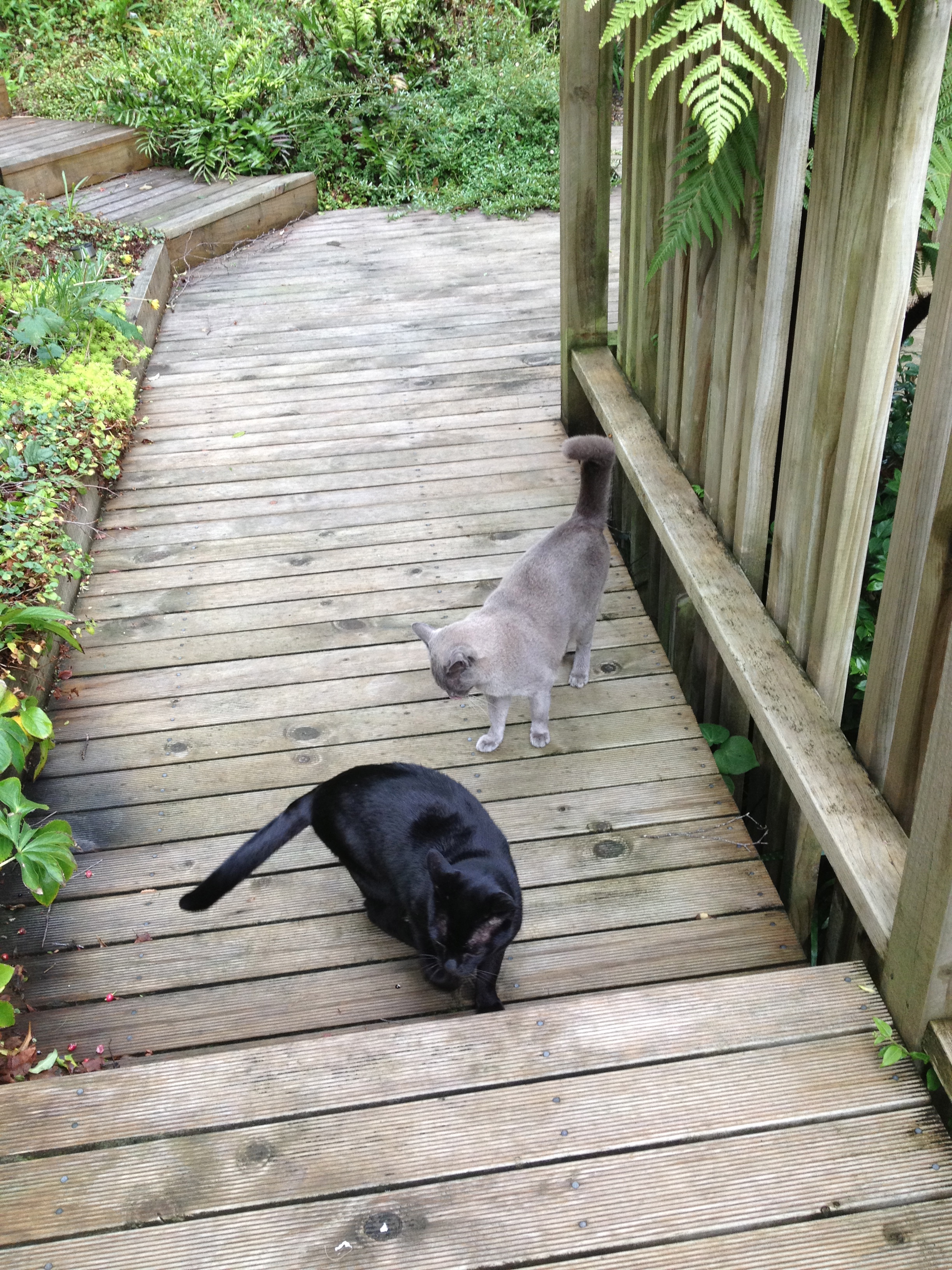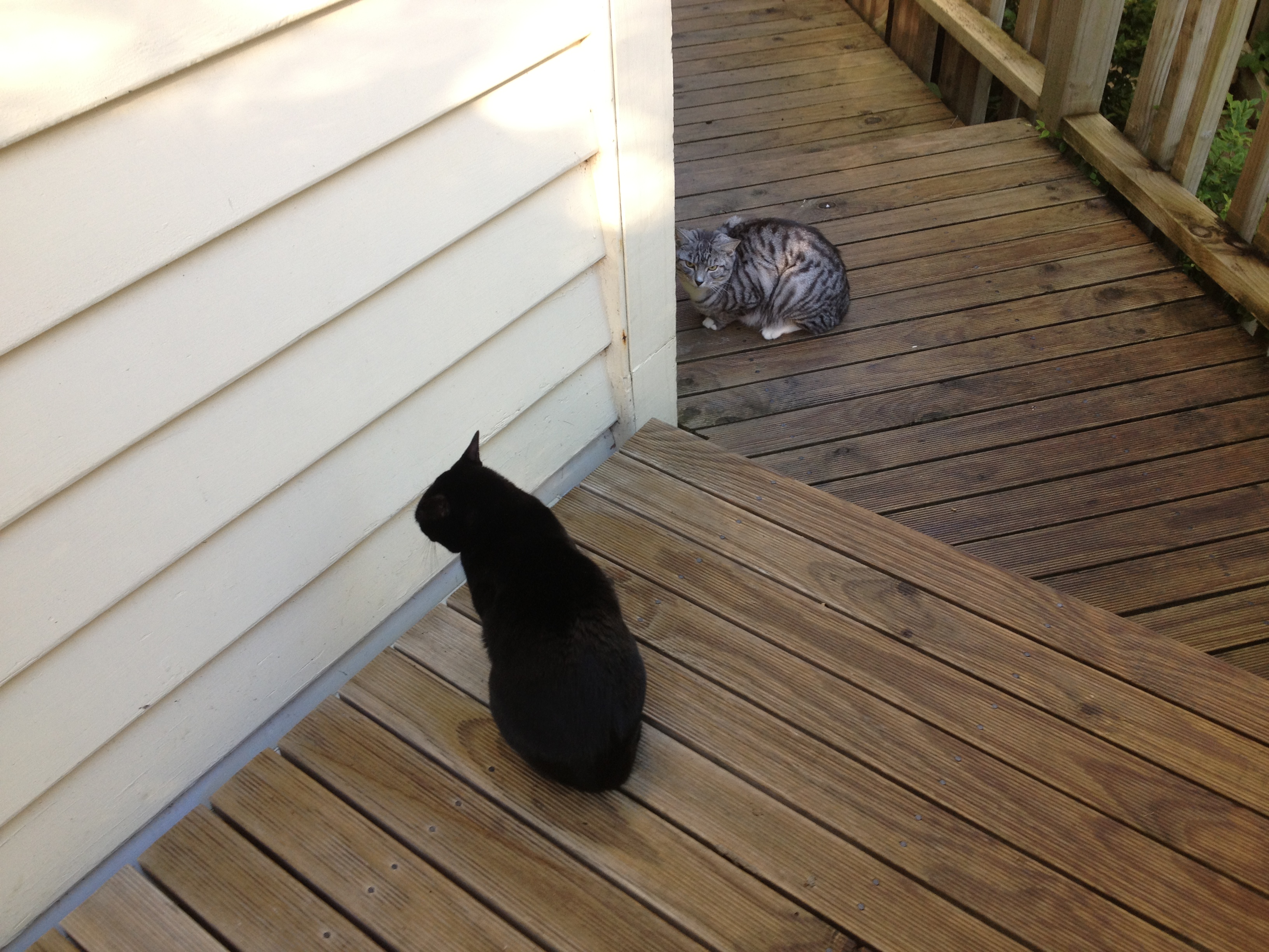 Our visiting cat has been rather agitated recently, not really being quite so settled, and constantly on alert. Clearly something was going on in cat world, though what we were not sure – a new cat, some damage to the area after the storm (though we, of course, couldn’t see anything), a portent of a forthcoming earthquake? Well, it turns out there is a turf war going on, and our house seems to be part of the border dispute. On Friday, a lunch time conference saw misse moj (‘our’ cat) and the rather lovely grey cat who has been here a few times, at least rub noses and make friends.