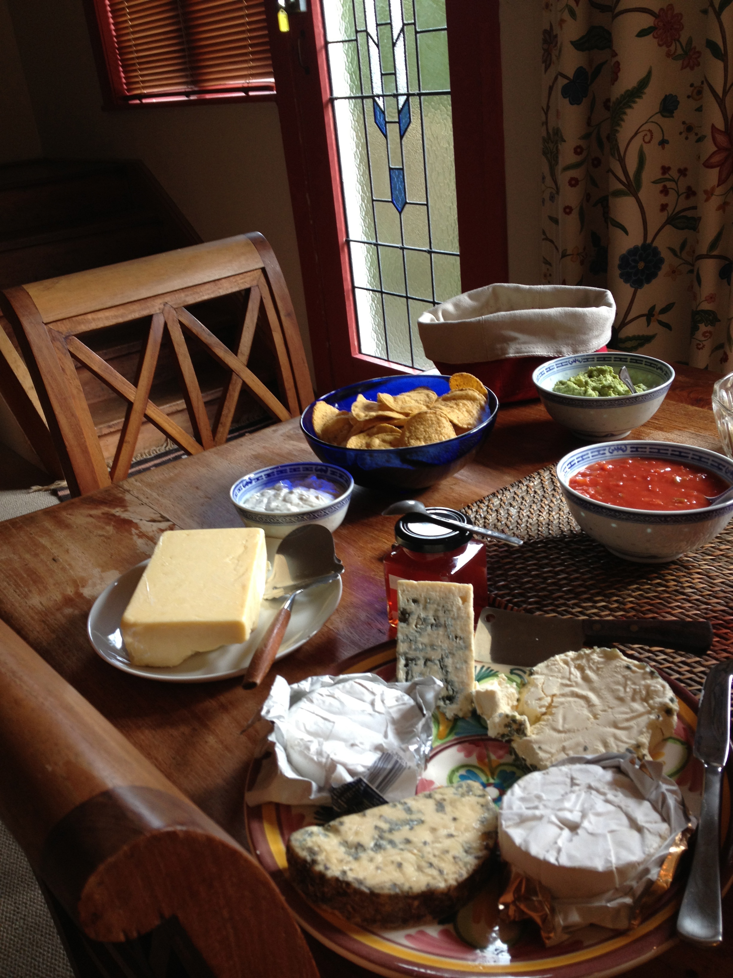 I covered the table with salads, dips, bread and cheese of all sorts, and for ‘desert’ passed round bowls of M&Ms and mini bars of hokey pokey chocolate.