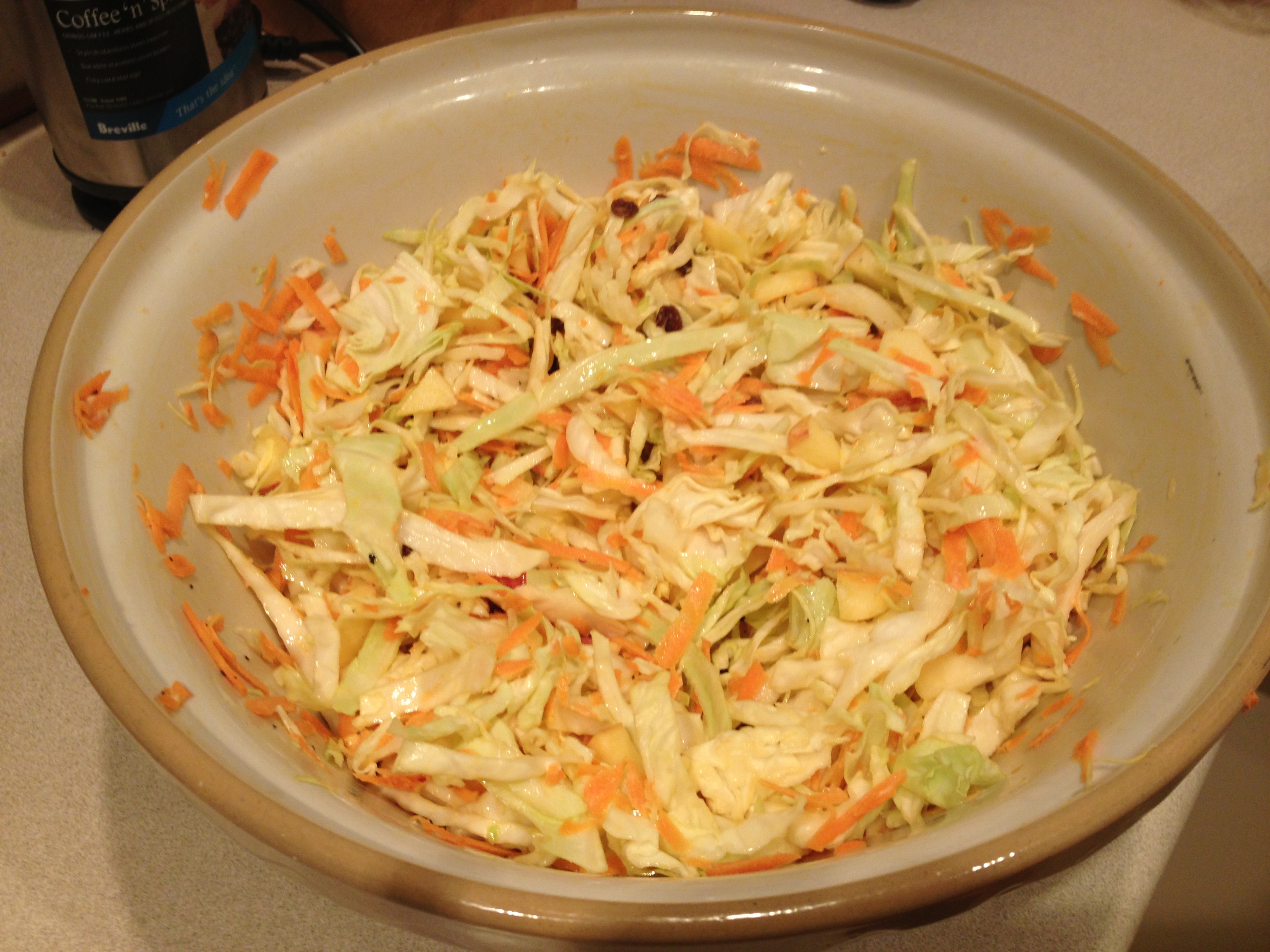 To use up some cabbage, I made a giant bowl of coleslaw that was enough for 10. I make mine with finely shredded cabbage, grated carrot, a couple of handfuls of sultanas and a little finely chopped apple, mixed with mayo.