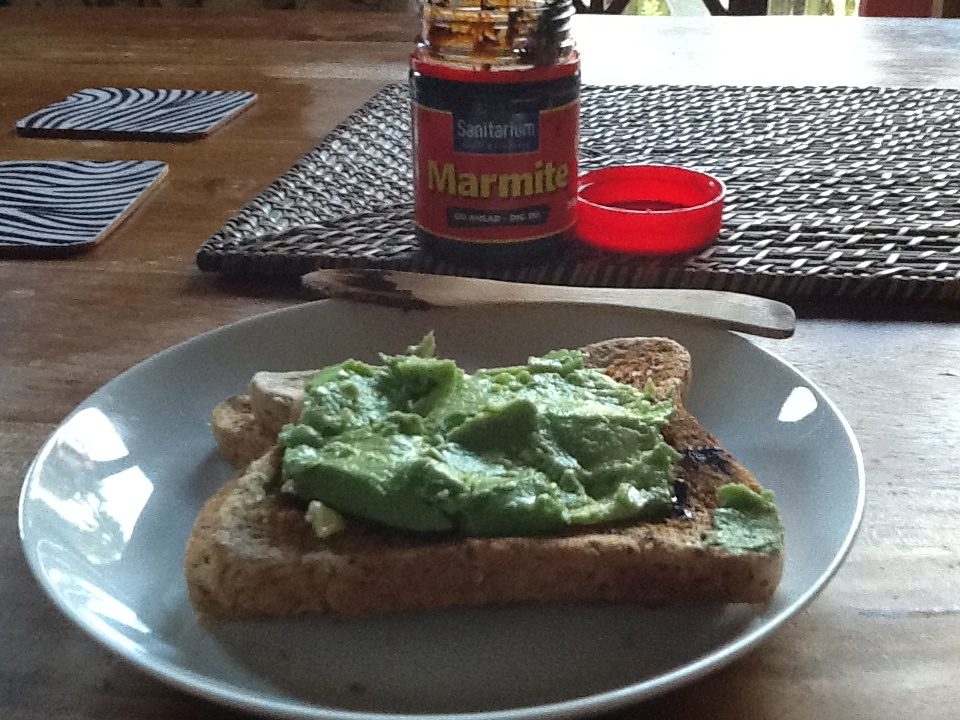 I am a morning person, and also someone who likes breakfast. In fact, I can’t function without eating first thing in the morning. Being kind of semi lactose intolerant as well as finding the smell and even the thought of drinking milk unpleasant, I don’t eat cereal (and yes I know I could put soya milk or yoghurt on it, but I don’t like that cold feeling first thing in the morning either…yes, I am fussy!). So, breakfast for me is toast or bread or sometimes croissants at the weekend. The joy of toast is that it is such a versatile foodstuff. You can put all sorts of things on it, creating new breakfasts every morning. My ‘go-to’ (ugly expression but useful) breakfast topping is low fat cream cheese, but I also like peanut butter, sometimes topped with a little cheese, or of course eggs in any shape or form, preferably with Kalles Kaviar when I can get hold of it. Yesterday I had another favourite – Marmite and avocado.