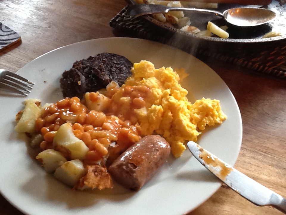 Today, being Sunday, we decided to go all out and have a full cooked breakfast, the sort that renders you useless for much of the rest of the morning. There was some good black pudding from Moore Wilson’s, sausages, fried potatoes, bacon, scrambled eggs, toast, orange juice, tea for me and coffee for Karl.