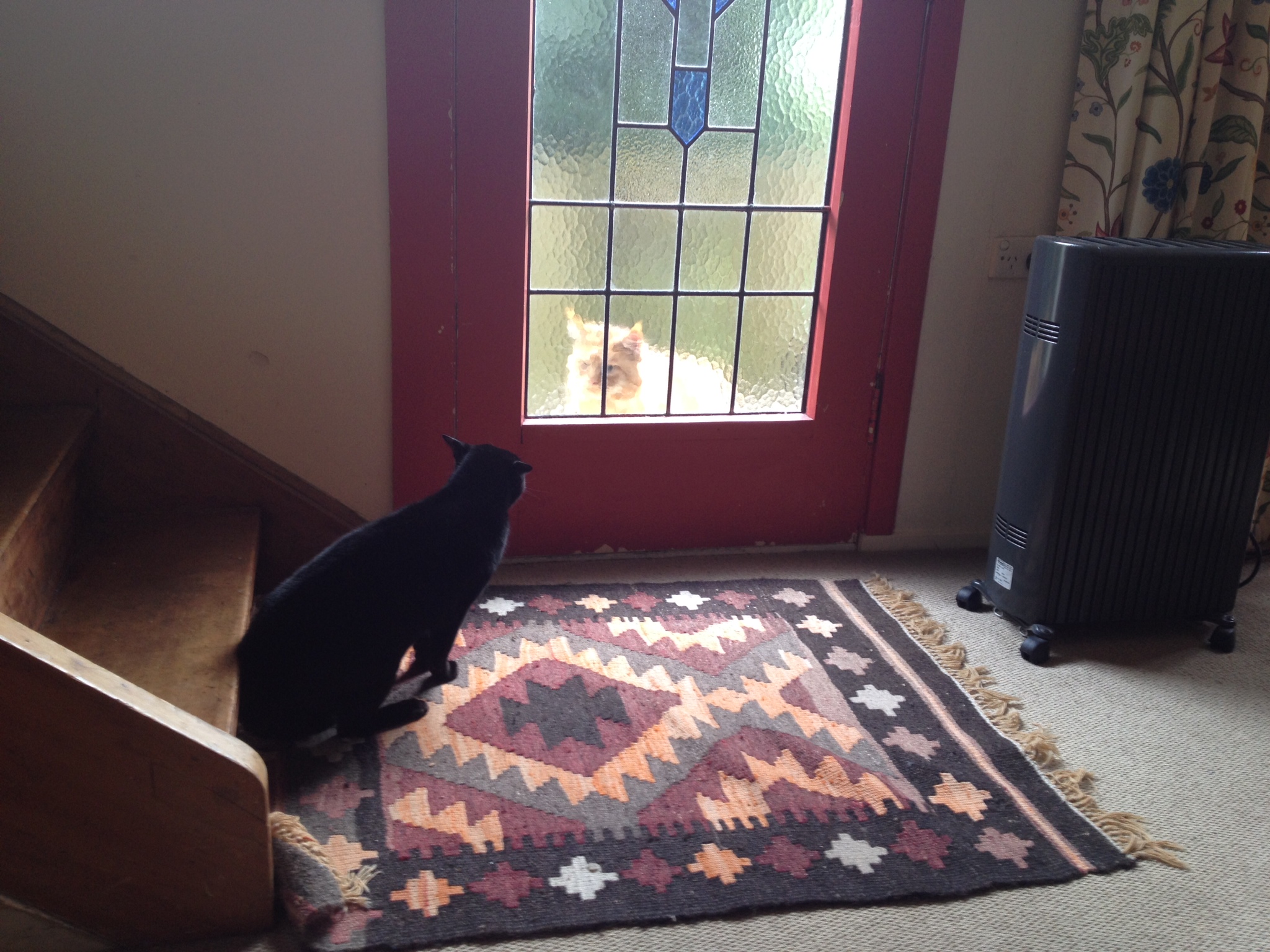 Having a few days off has meant being at home quite a bit more, and so we were there to witness a cat standoff. As predicted, Misse Moj met Bodie, our new ginger neighbour with extremely noisy results. Bodie is about twice the size of Misse Moj, but looked almost confused and certainly bemused by Misse Moj’s behaviour and extremely loud caterwauling. Actually, poor Misse Moj got really quite agitated and we tried to bring him indoors, but as you can see, Bodie just peered through the glass and it all started up again. Anyway, Bodie’s owner came looking for him, and calm was restored.
