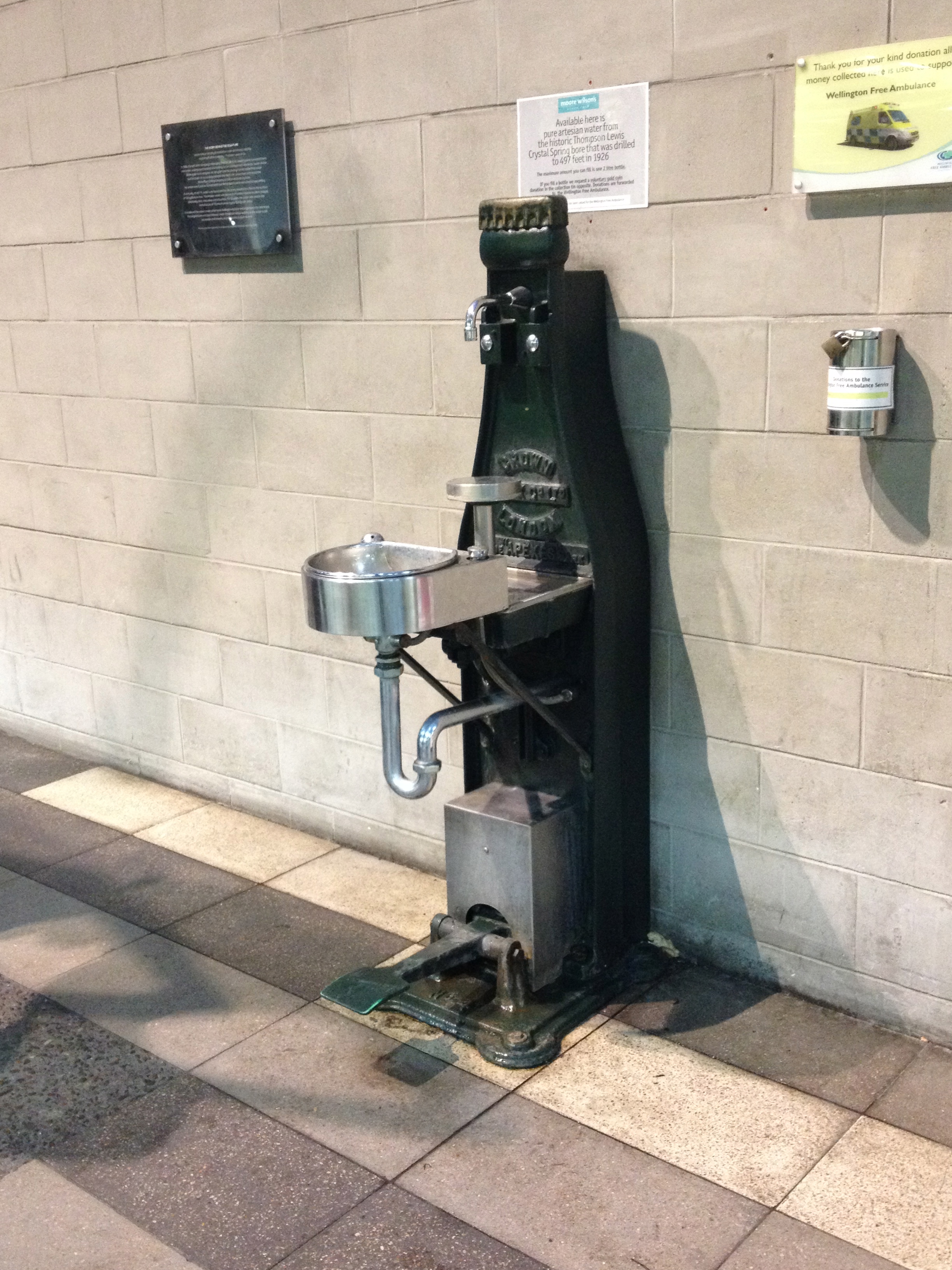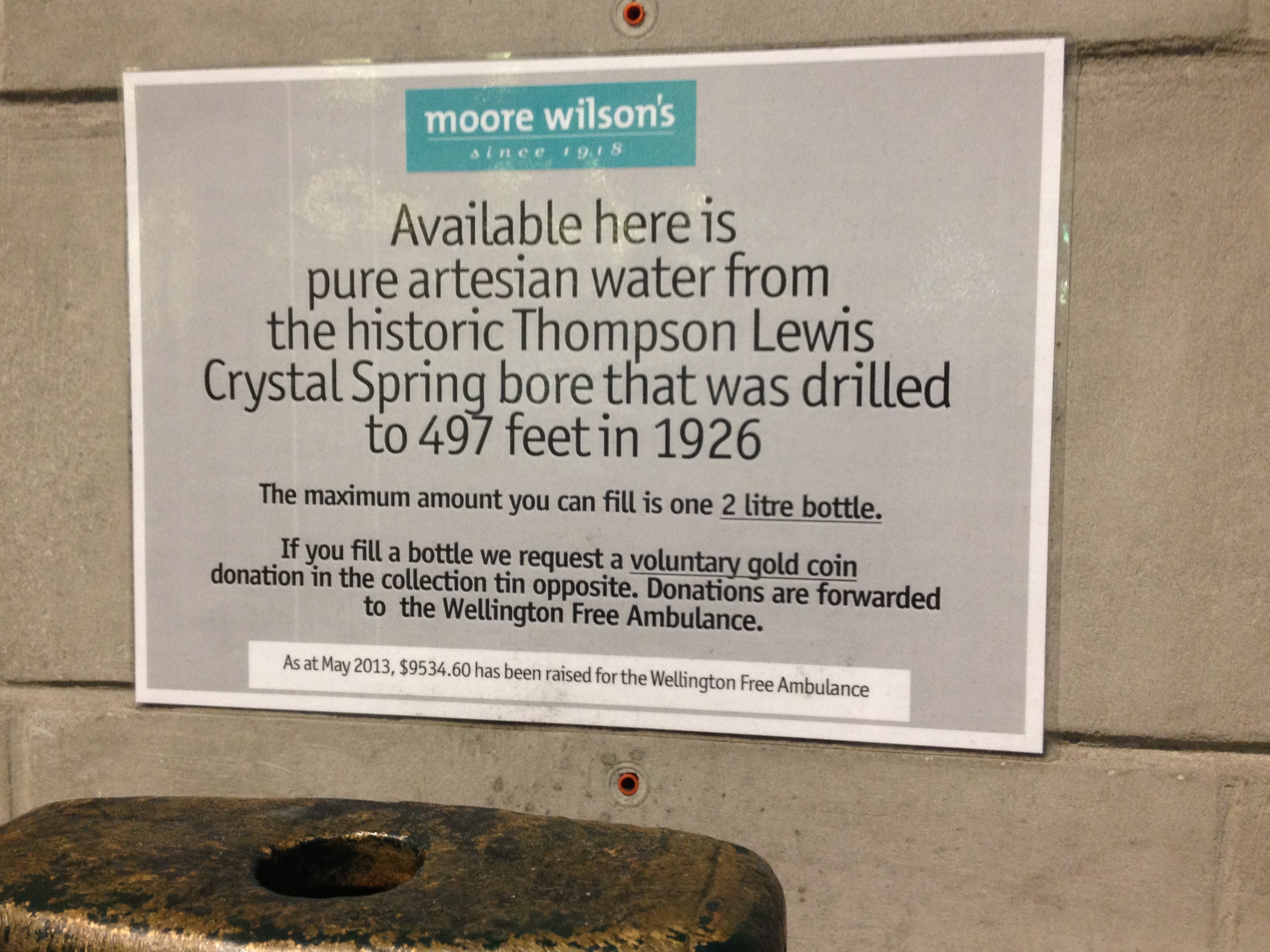 Living in New Zealand, we are lucky, compared to many places in the world, to have access to good, clean drinking water. With a move to ban bottled water in cities like San Francisco, it is good to note that in Wellington, there is an artesian fountain providing pure, unfiltered water from deep beneath Wellington Harbour for us all to use. It is situated outside one of my favourite shops, Moore Wilson. The well was originally installed (is that the right word?) by a soft-drinks factory that used the water to make ginger beer and other sodas.