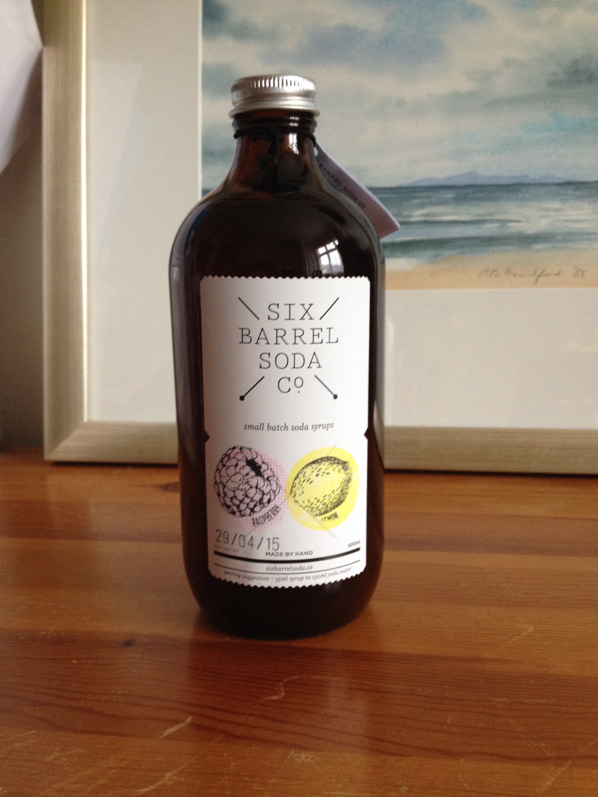 A bottle of soda syrup with a picture painted by my Mum in the background