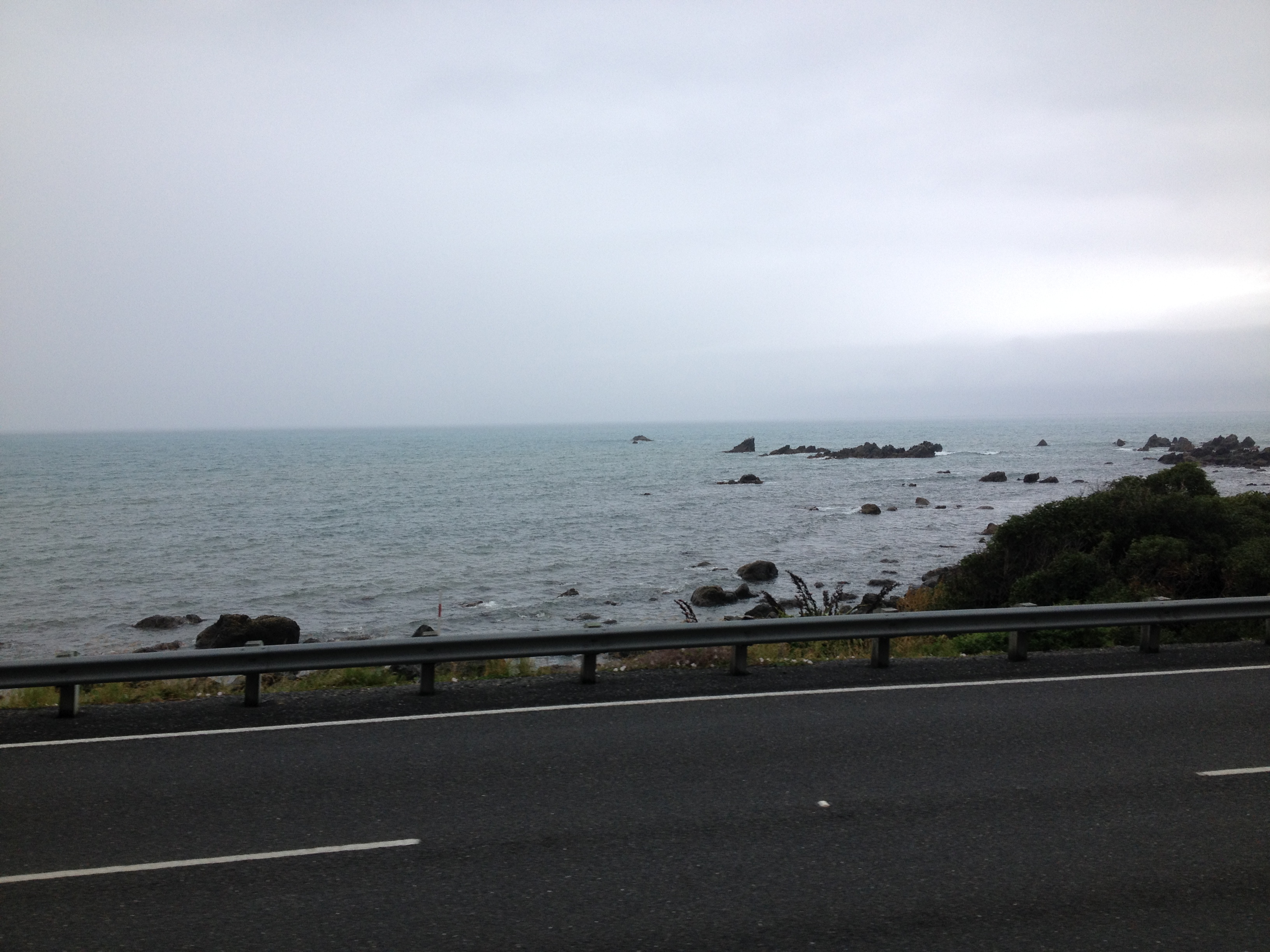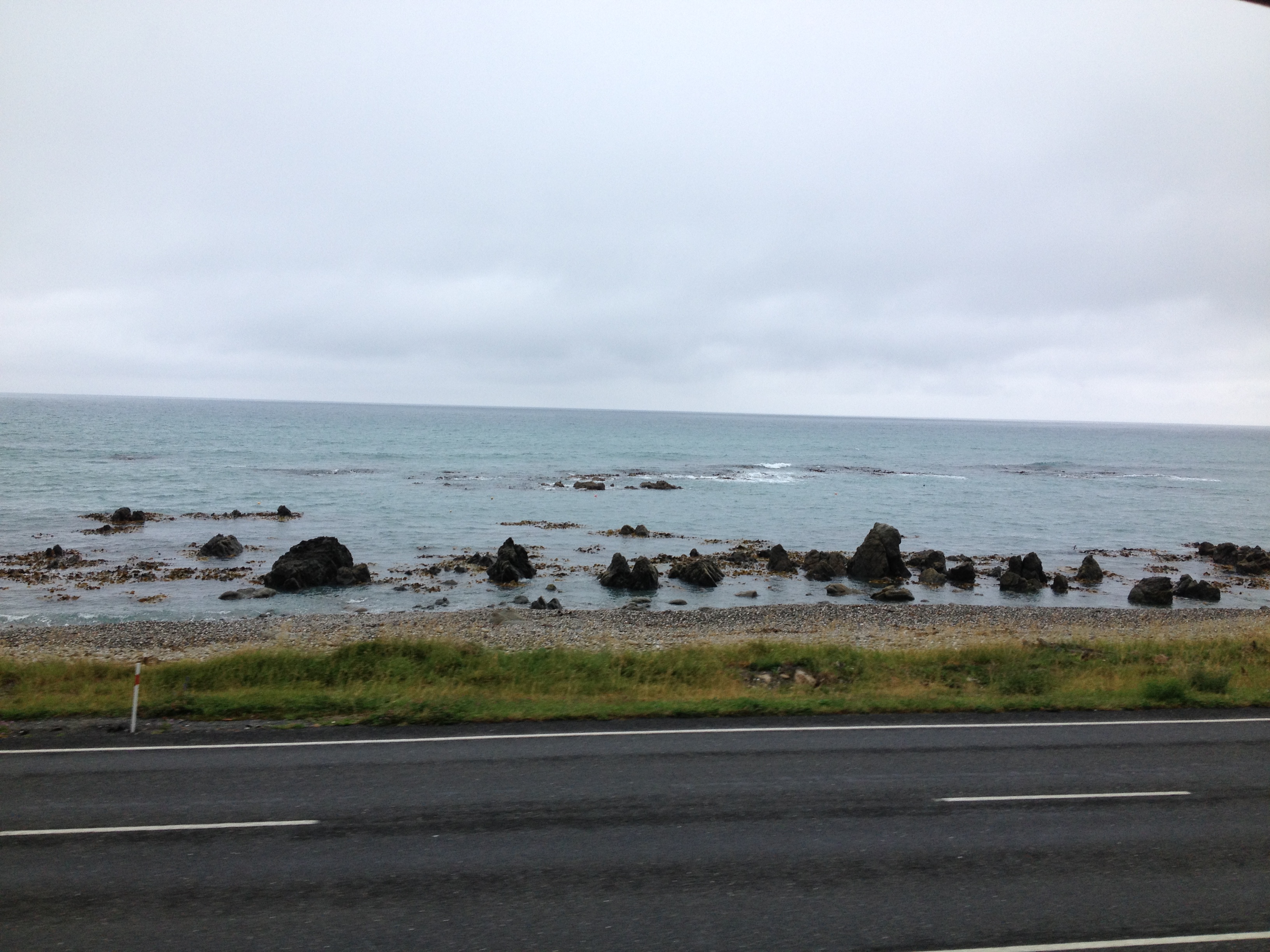 The pink colour of the crystallisation ponds is caused by natural microscopic algae that change to pink in the high salt concentration. The train travels past the Hikurangi Trench, which is between 1000 and 2000m deep and the inland Kaikoura Ranges. Due to the weather, our views were limited, but it was still a fantastic trip. Below are some rather gloomy pictures, out to the Pacific Ocean, some taken through the window, some from the rather windy viewing carriage and some featuring loads of seals (believe it or not!).