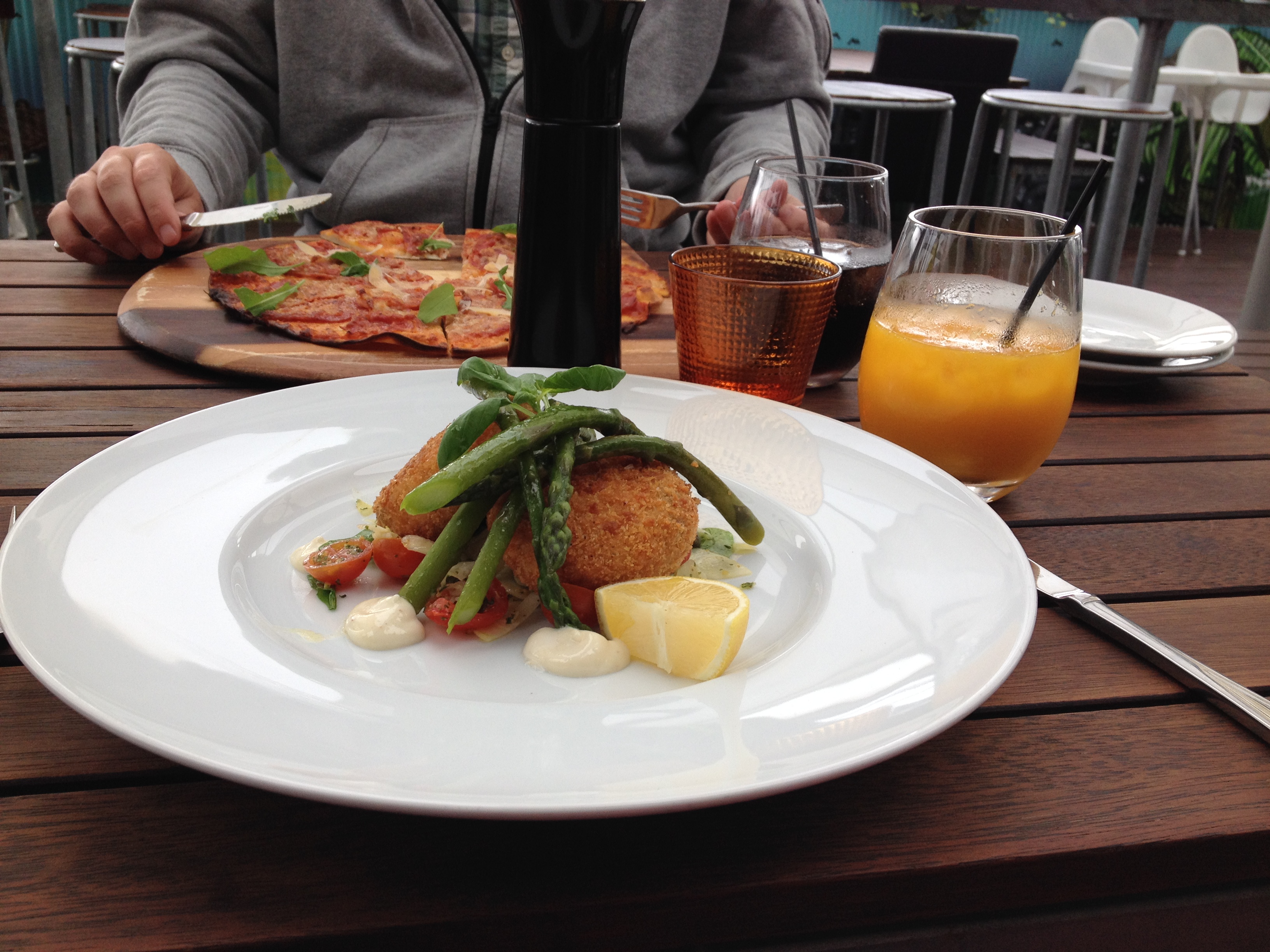 We went to Lyttelton the last time we were in Christchurch too, and caught the Saturday market. This time we were there on a Sunday, and the place was rather quiet to say the least. We stopped for lunch at Freemans on London Street, sitting out on the deck. I had smoked salmon fish cakes, while Karl had pizza. Both were excellent, the fish cakes being full of flavour and accompanied by asparagus, beans and an excellent sauce.