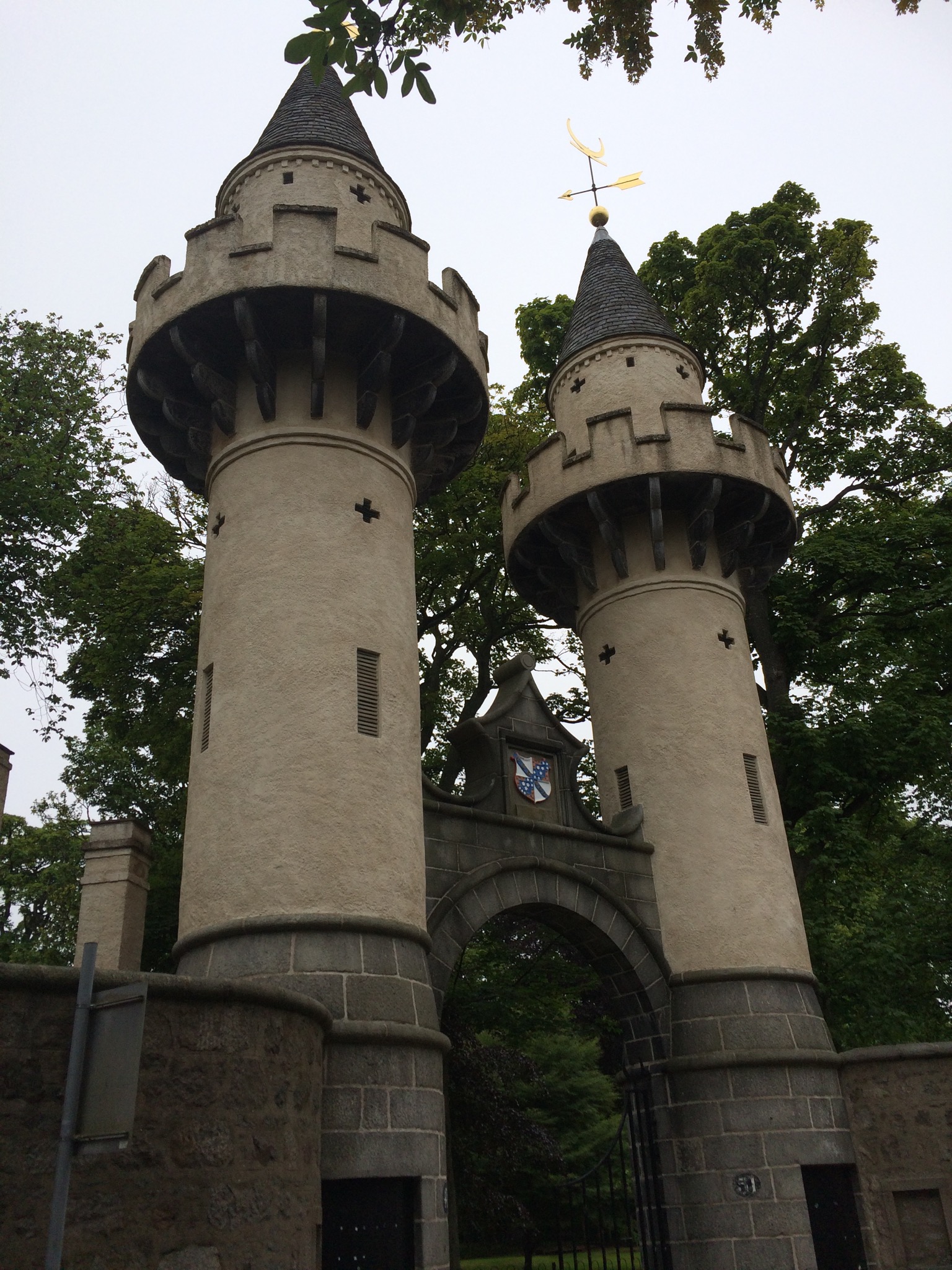 Clearing all thoughts of politics from our heads, we concentrated instead on enjoying a lovely day with my nephew and family in Aberdeen.  The city is known for its grey granite buildings and is the third largest in Scotland.  The haar or sea fog had rolled in, but didn’t dampen the day. Fortified with a breakfast of waffles and eggs, we set off into old Aberdeen and the area around the University.  One of the first things we spotted was the Powis Gates, erected in 1834 by Hugh Fraser Leslie of Powis, whose family originally owned the land behind the gates. Rather incongruous, they are nevertheless a landmark.