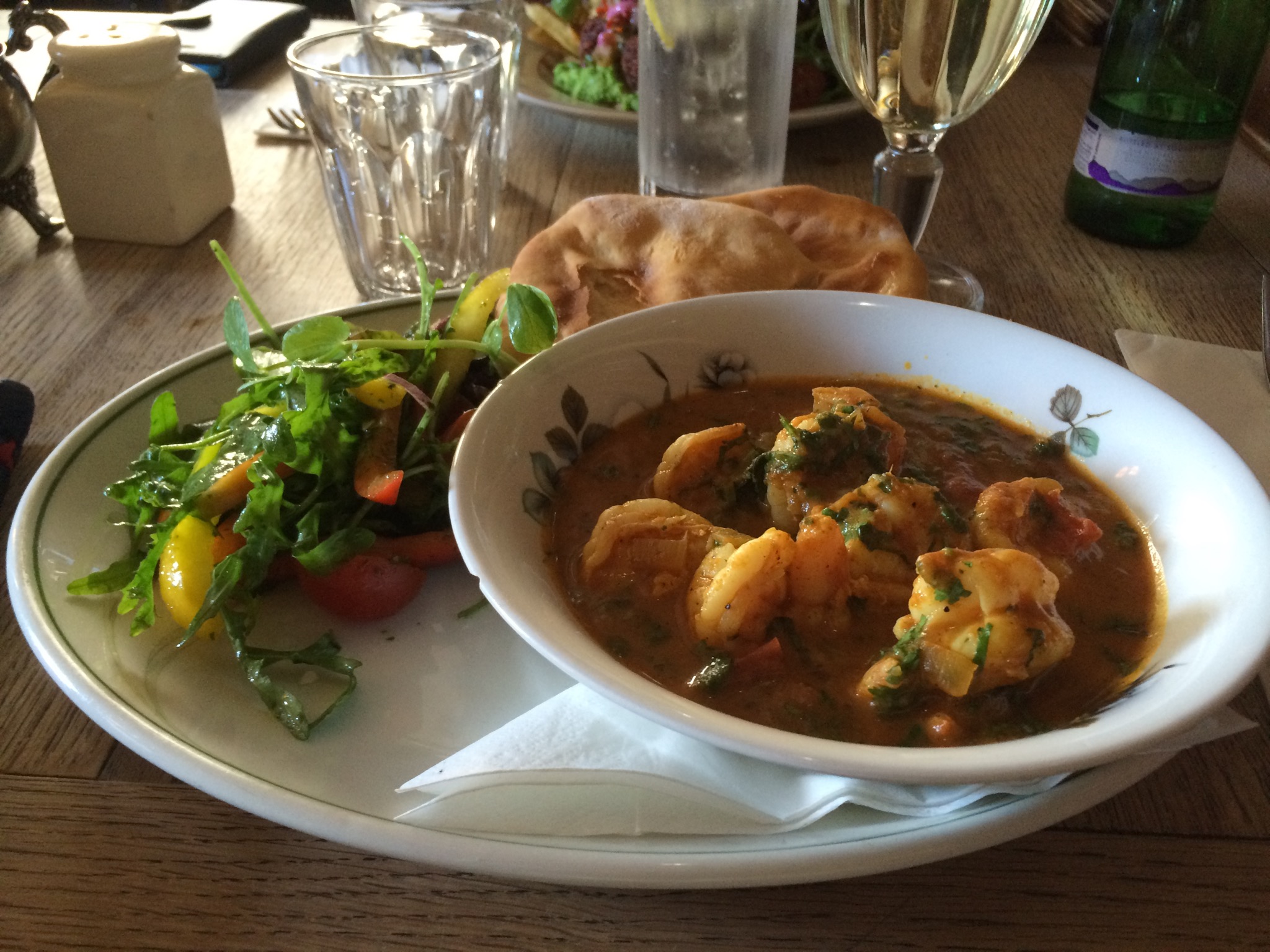 This time was no exception in terms of a brief and intense stop, but it was lovely to see my brother, nephew and partner and their gorgeous 5 year old son and lots of old friends. I grew up in Leith, and it was there we headed on Monday after our two days in Glasgow, to have lunch with a friend from Edinburgh University days at the Roseleaf Bar and Cafe on Sandport Place (couldn’t find it as the area had changed so much!). I had a really nice spicy prawn dish, served with flat bread, and a glass of rather good viognier.