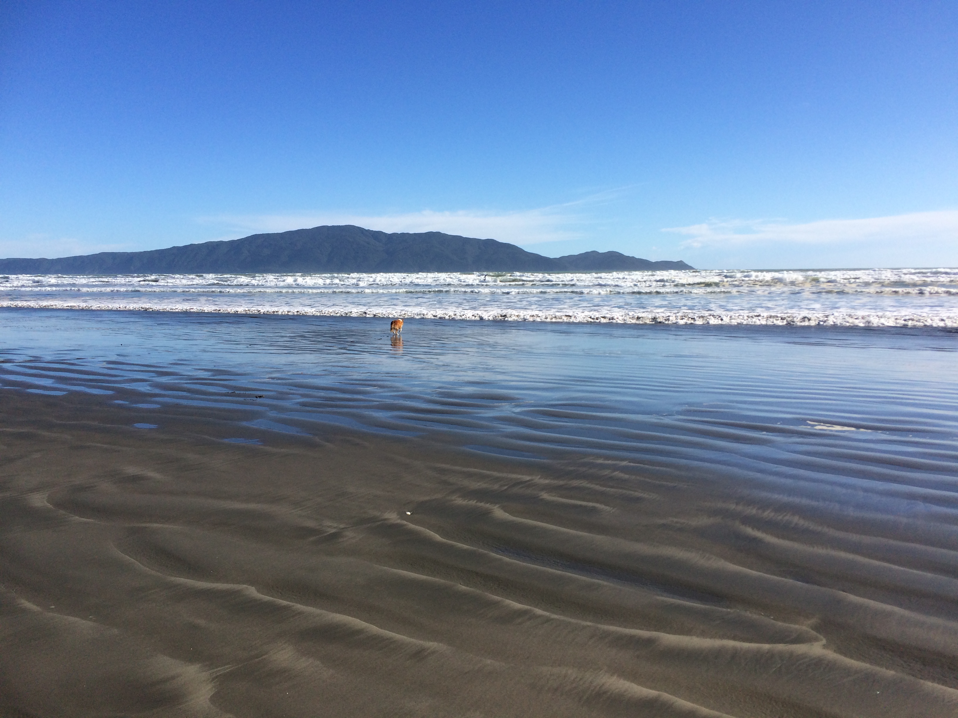Dog running into the sea, Paraparaumu