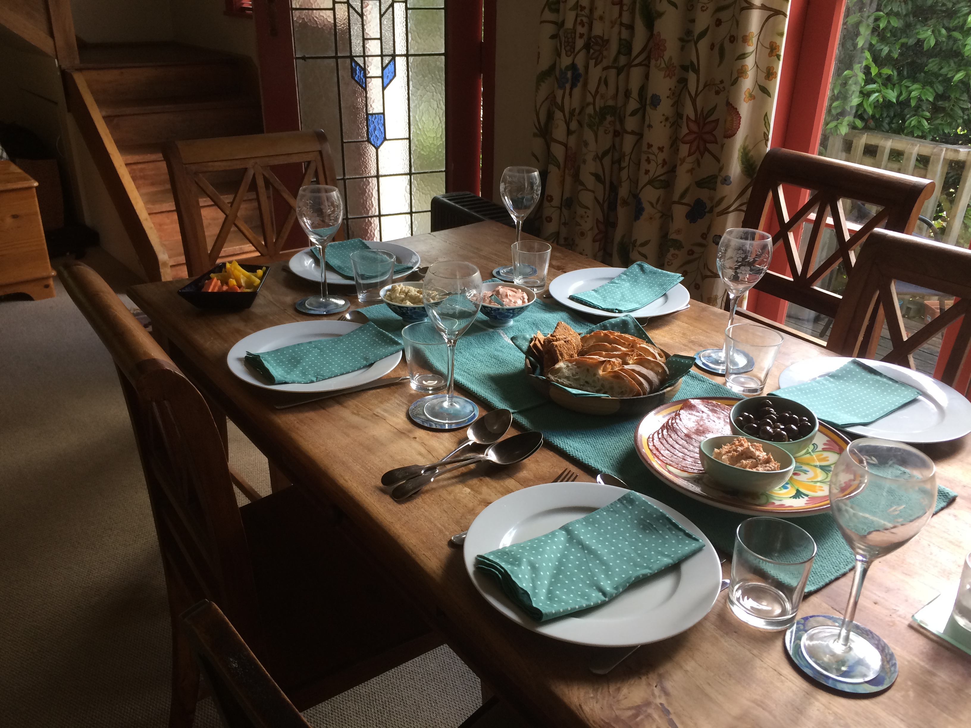 We had three guests on Saturday, and it was fun to set the table with summery napkins (note the unironed effect in the picture at the top of the post, of course deliberate….) and welcome platters. I have to admit I am usually lazy with a first course, preferring to pick up some nice bread, salami, olives and paté for people to pick on when they arrive.