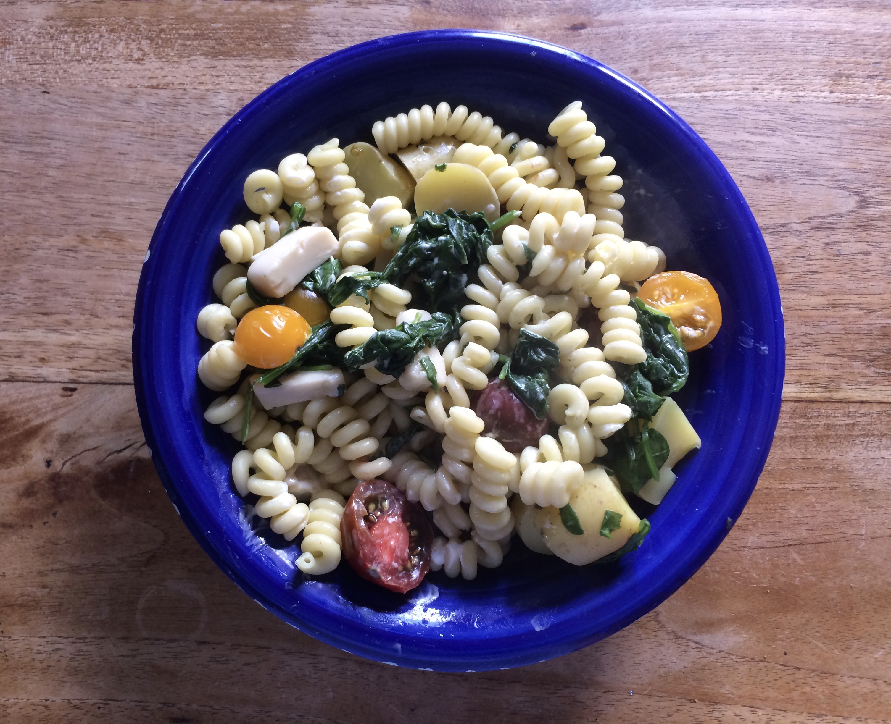 And so to lunch, which was a good mix of leftovers from the fridge – pasta, spinach leaves and cherry tomatoes, along with four little leftover potatoes. Into that, I stirred this blue style vegan cheese from Sheese. I have to say that this did very well in the taste test, almost tasting exactly like a mild blue cheese. It doesn’t look like blue cheese, but it the flavour is very close to the real thing.