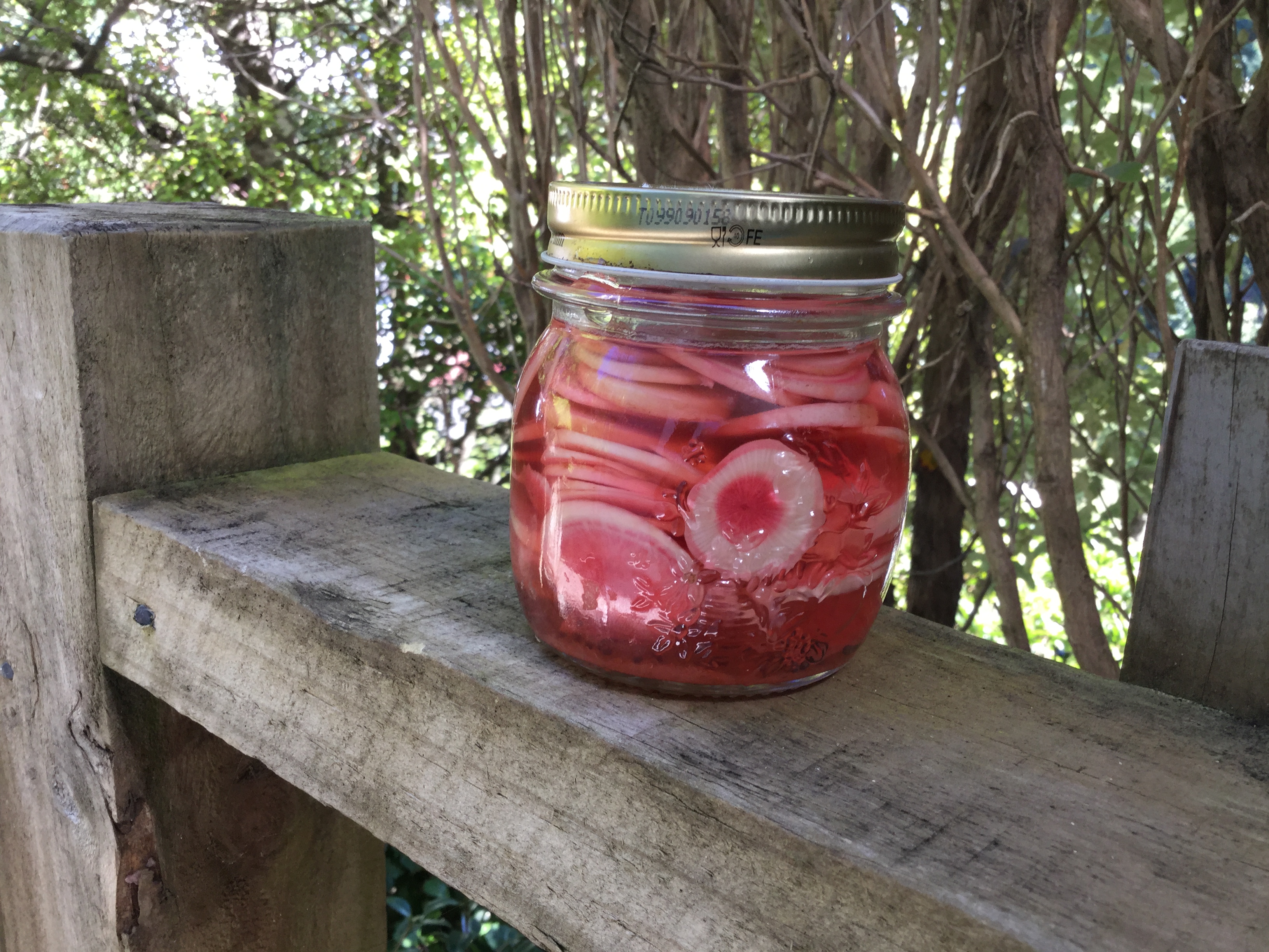 Thinly slice the roots using a mandolin or sharp knife. Whatever, watch your fingers! Place them in an sterilised jar (put in a warm oven or use boiling water – follow this link). Mix together 3/4 cup rice wine vinegar, 1/4 cup water, 1 teaspoons salt (I used pink Himalayan salt) and 2 teaspoons sugar. Pour over the radishes, add 6 whole black peppercorns and 1/2 teaspoon black mustard seeds and stir. Refrigerate for at least 8 hours.