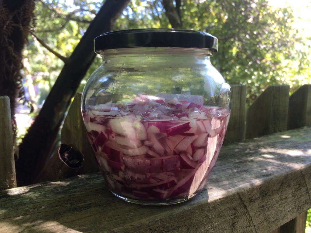 For the quick pickled onions, thinly slice a red onion, place the onion in a jar with a tight fitting lid, add 125ml white wine vinegar, a pinch of sugar and a pinch of salt and 60ml warm water. Shake and chill in the fridge for at least an hour. This keeps for up to two weeks, and also makes a great accompaniment for burgers (meat or otherwise).