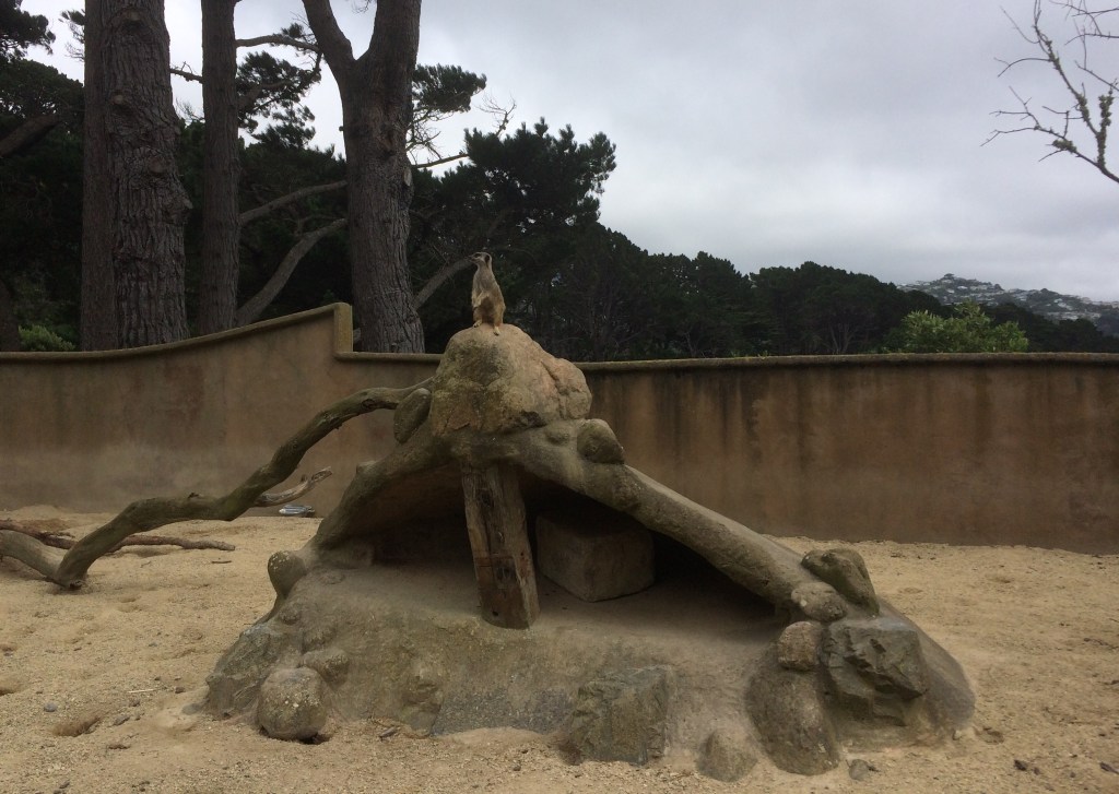 Sunday was a bit overcast, but warm and humid, and the animals were all rather lethargic as a result. All that is except one young chimpanzee, who found two empty sacks, and carried them up to one of the platforms in the play area, and proceeded to shake them out, and try to make…well a sort of nest or cosy place to be along with one of the ropes that he seemed to be using to lie on. It was such fun to watch. The meerkats were also out and entertaining us, but the penguins were hiding and many of the other animals preferred just to doze.
