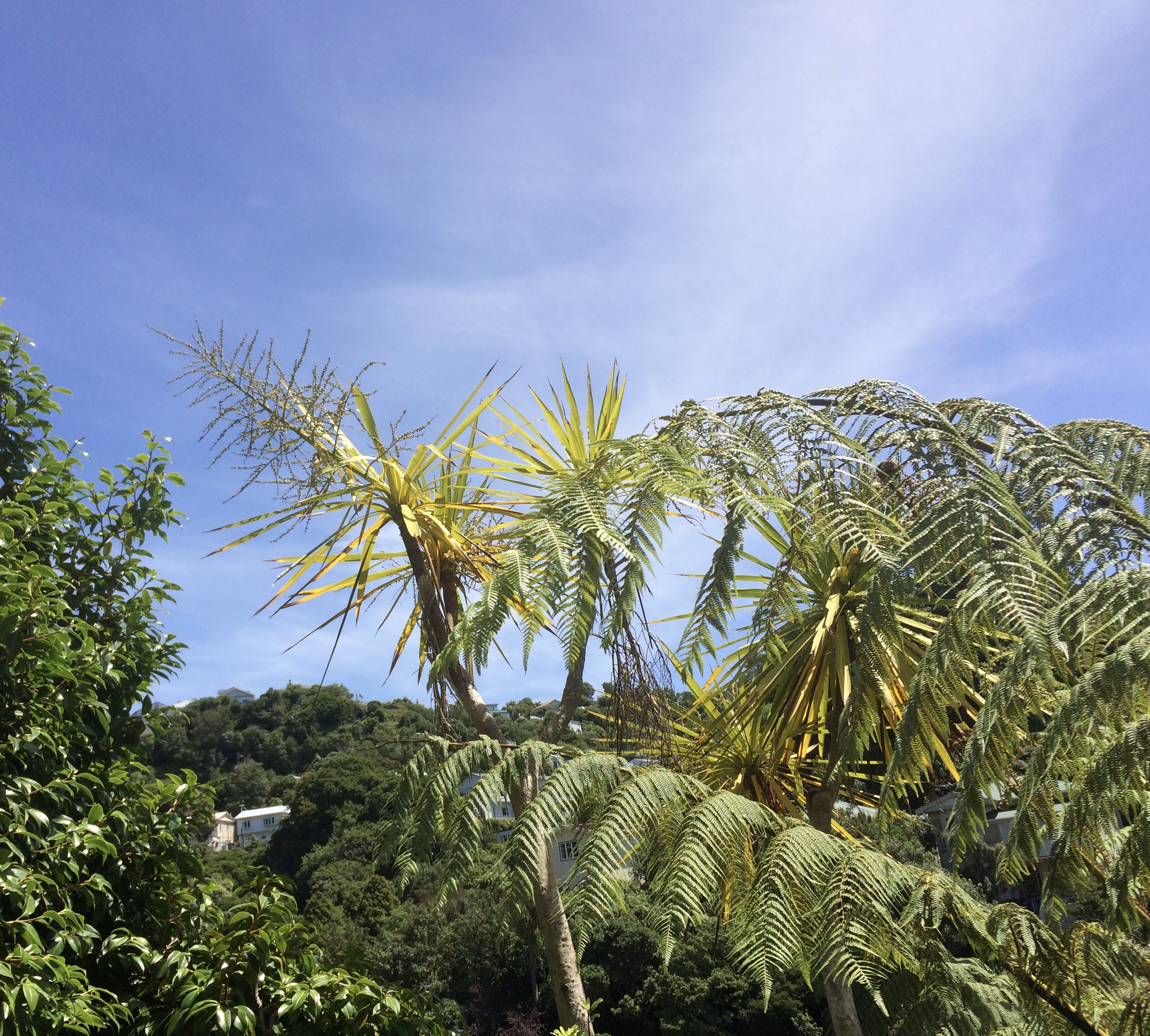 Finally, I think I post pictures of the sky almost every week. Anyway, our remaining cabbage trees are at least flowering. The ferns of course just keep on growing.