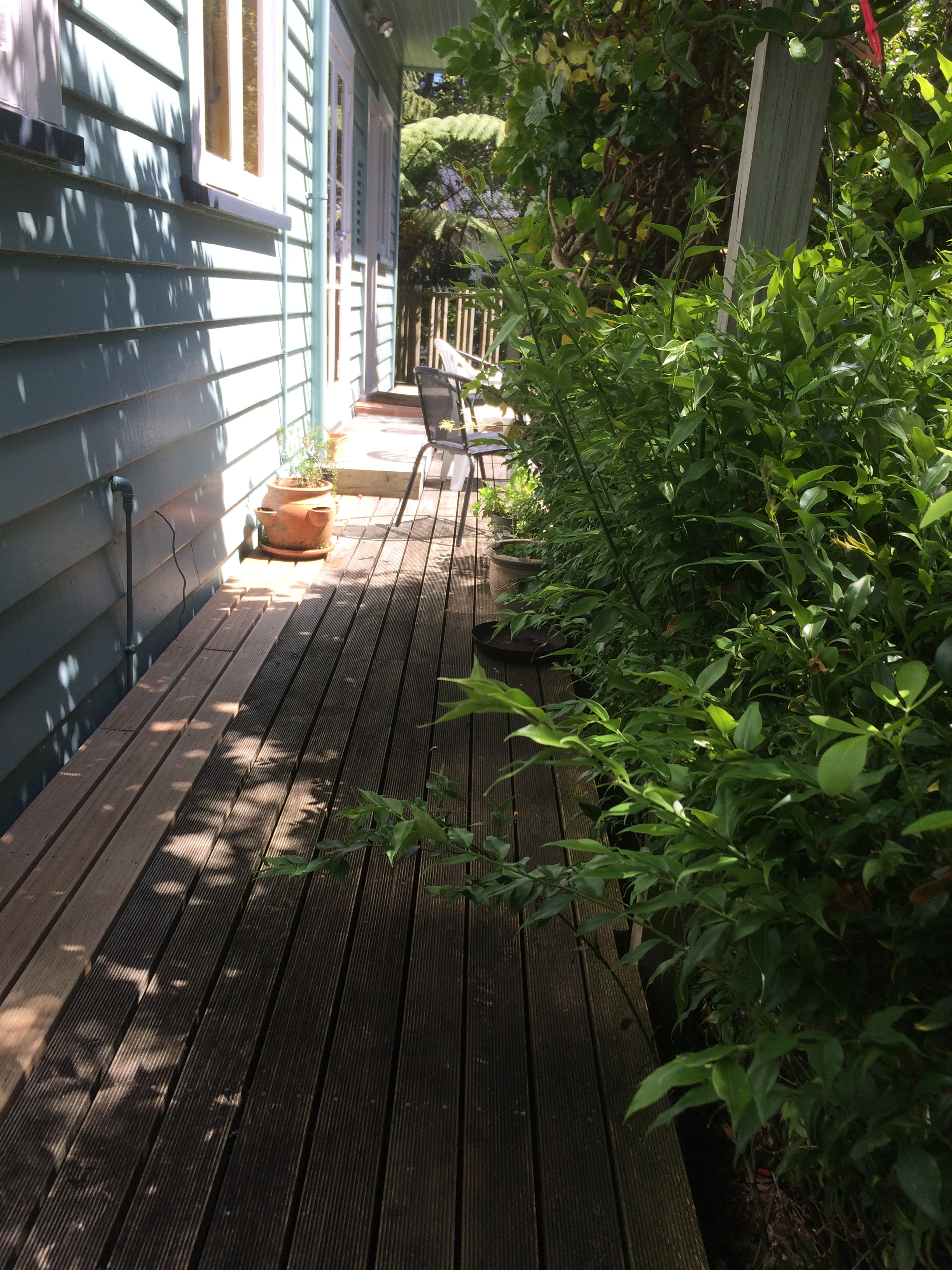 Second up we have had a lot of tidying up to do today. There has been quite a bit of the cutting back of branches, in one case, a fern branch that was hanging over the steps to the house just a bit too much. I also need to weed the ‘dingy patch’, which is what I call the area which is behind where I am standing to take this photo. It is always in shade and the soil is poor, needing to be nourished before anything much (apart from weeds) will grow. As it is an area we never use for sitting in, it is also much neglected. I keep thinking it would be a good place for a compost heap.