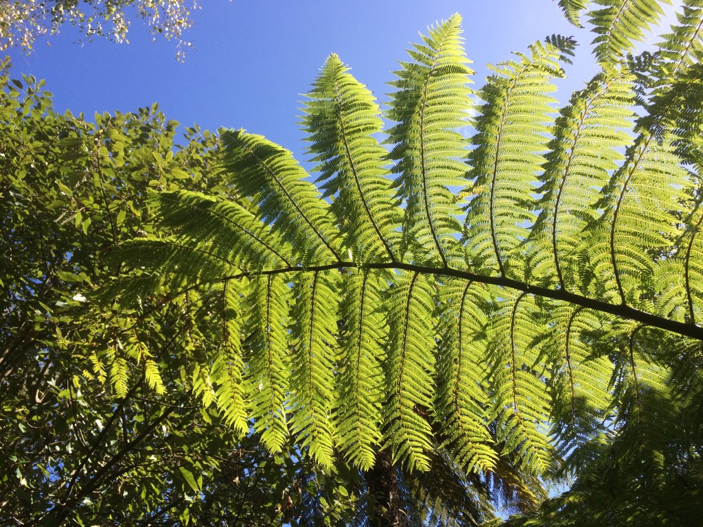 First up, today’s weather, with a return to autumn sunshine. Here’s one of our ferns again against the bright, blue skies.