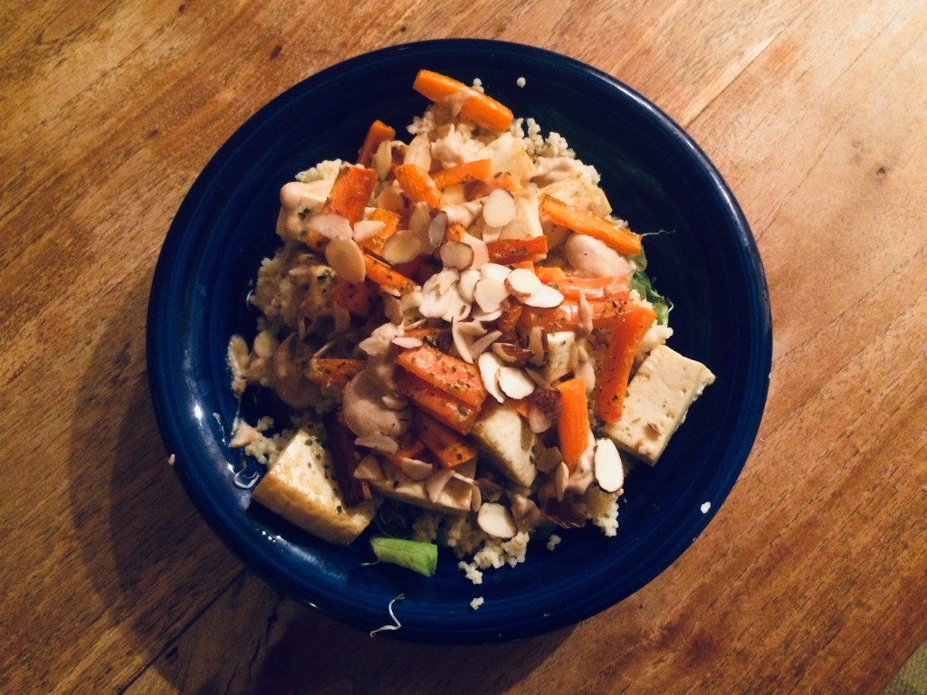 I’m also cooking for myself for the third night in a row, which has meant mushrooms on toast, a millet, roasted carrot and crispy tofu bowl topped with almonds and a tahini and lemon dressing and some green leaves, and the delights of roasted broccoflower.