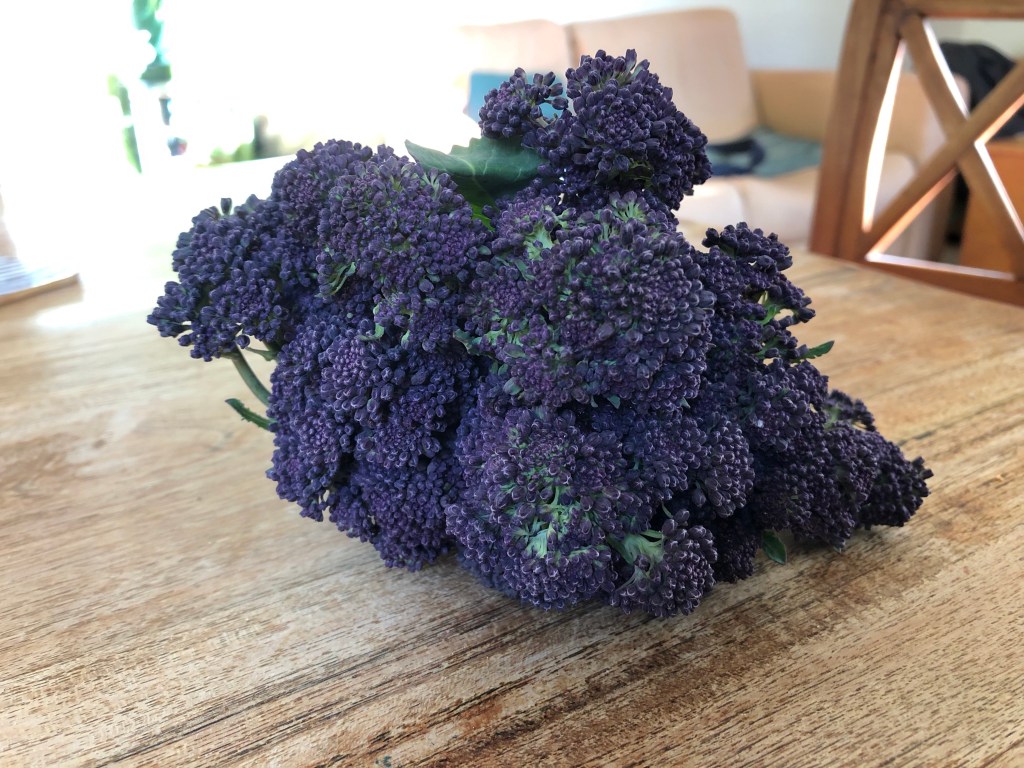 As well as picking up some more kale, I also saw this lovely looking purple sprouting broccoli. There are some good veggies around just now: aubergines for a moussaka, silverbeet and red Swiss chard.