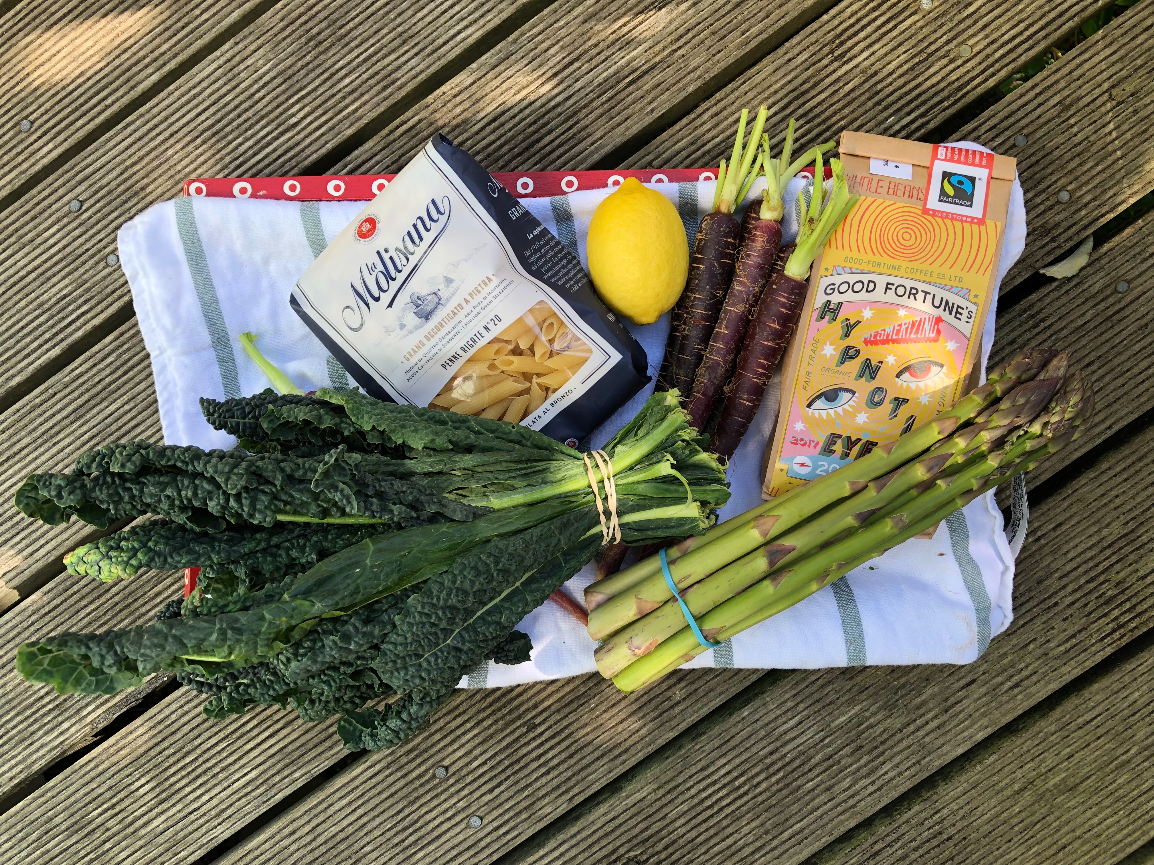 On Friday we went to see the Irish comedian Dara O Briain, who had me laughing the whole evening. It was a good way to start the weekend! Saturday morning followed the usual pattern these days, with toast (the avocado again) and tea at Squirrel, and then picking up some food for the week: apples for a crumble with rhubarb, ginger to mix with soy sauce, olive oil and maple syrup to top a piece of salmon (thanks Julia Turshen!), red, yellow and orange yams, cavolo nero, mini purple carrots, lemons, pasta, coffee and some new season asparagus, amongst other things.