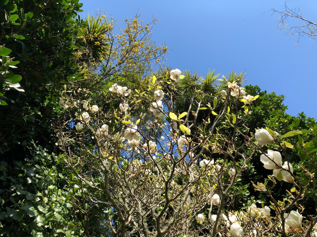 Finally, probably the last decent picture of the magnolia. You can see the kōwhai with its yellow flowers above. And as to last week’s ‘mystery flower’, I agree with those who said wild freesias, given they were in an old graveyard where all sorts of things grow you don’t find so often in other places.