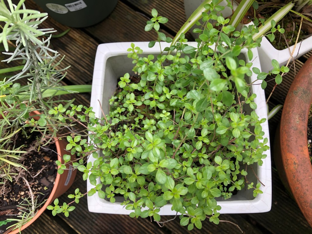 What’s hot and what’s not….the small rosemary, the lemon thyme, the mint, the bee balm balm bergamot are all doing well. The lemon balm is not…the new growth seems to have faded. I don’t know what has gone wrong, but I may move it and see if that helps. The one surviving basil plant is not going to make it, so time to get some more (the lemon thyme below is slightly out of focus as there was a touch of wind and it just didn’t want to stay still).
