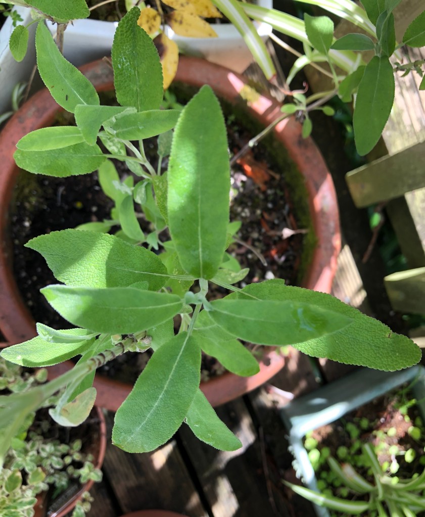 Elsewhere in my herbs-in-pots garden, I think I already mentioned that I have replaced one of my parsley plants, but have kept the other gone-to-seed one going as I think the flowers are so pretty. This was an Italian leaf parsley, so I need a new one of those at some point. I have two decent curry plants (the one below looked like it had died at the start of autumn, but I moved it and it seems to be doing well), and lots of lovely sage leaves and thyme.