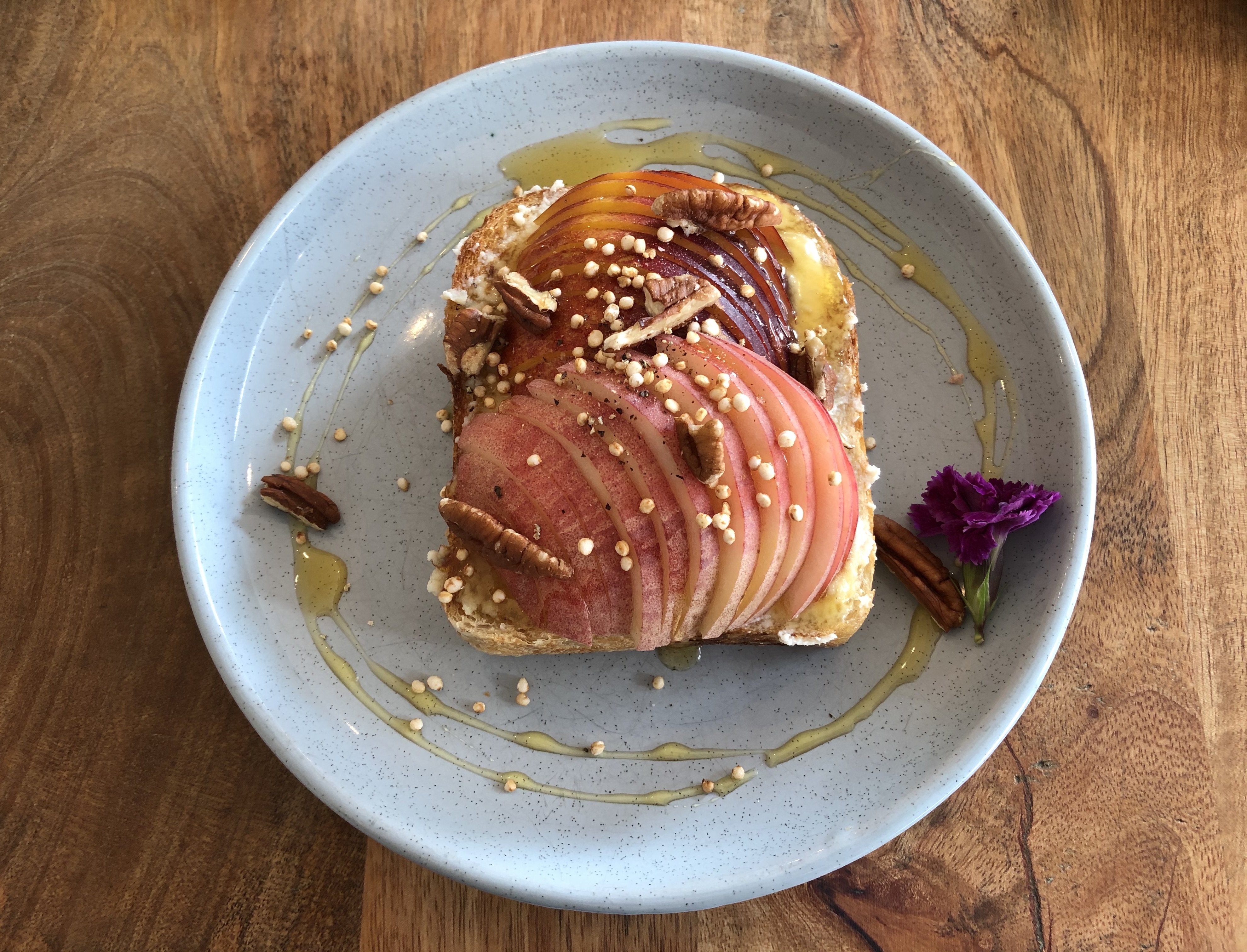 Now that the normal routines are slowly re-establishing themselves, my Saturday mornings are also returning to their regular patterns, with toast at Squirrel before Pilates. This week I had their new toast, ricotta on sourdough with peaches, popped quinoa, pecans and drizzled honey. Yes – as good as it sounds. I made a quiche with courgettes and ham, which turned out well, if not the most pretty, and a lemon, blueberry and rosemary cake from Sophie Hansen’s A Basket by the Door. I made it in a bundt pan then filled the middle with blueberries and topped it with a nasturtium for a bit of colour. It was quite lovely, topped with a dollop of yoghurt.