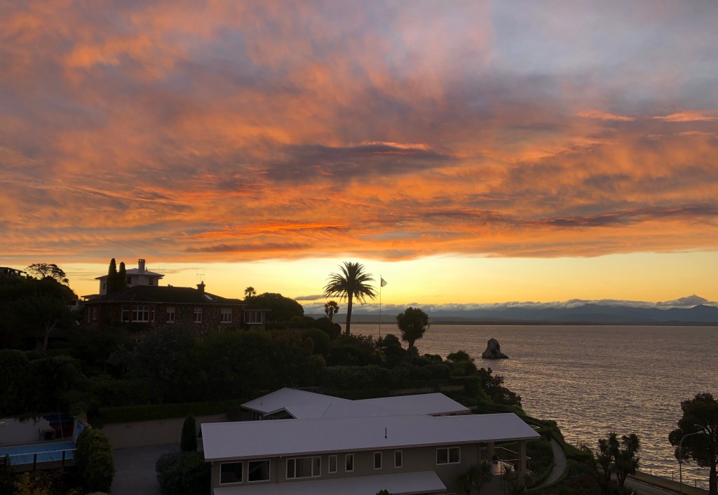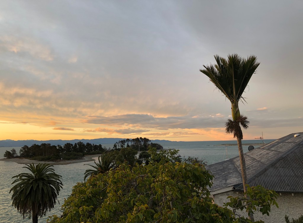 We drove back to Nelson, and then headed out for dinner before sitting on the balcony of the apartment and watched the sun set. The skies were stunning, as you can see below – a real small pleasure.