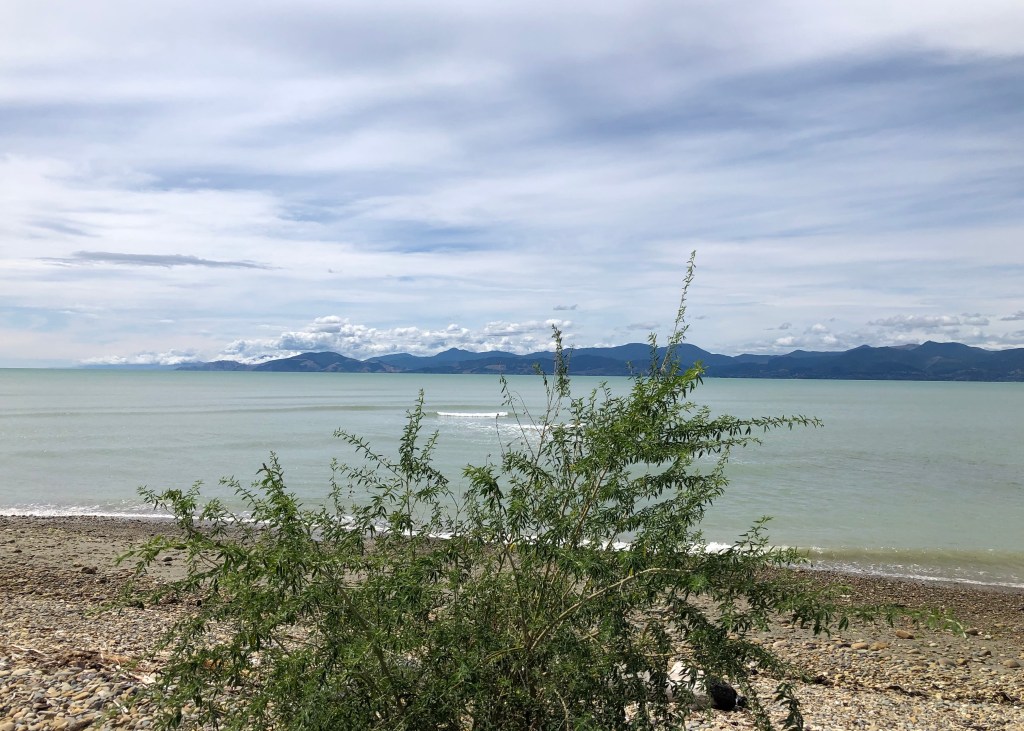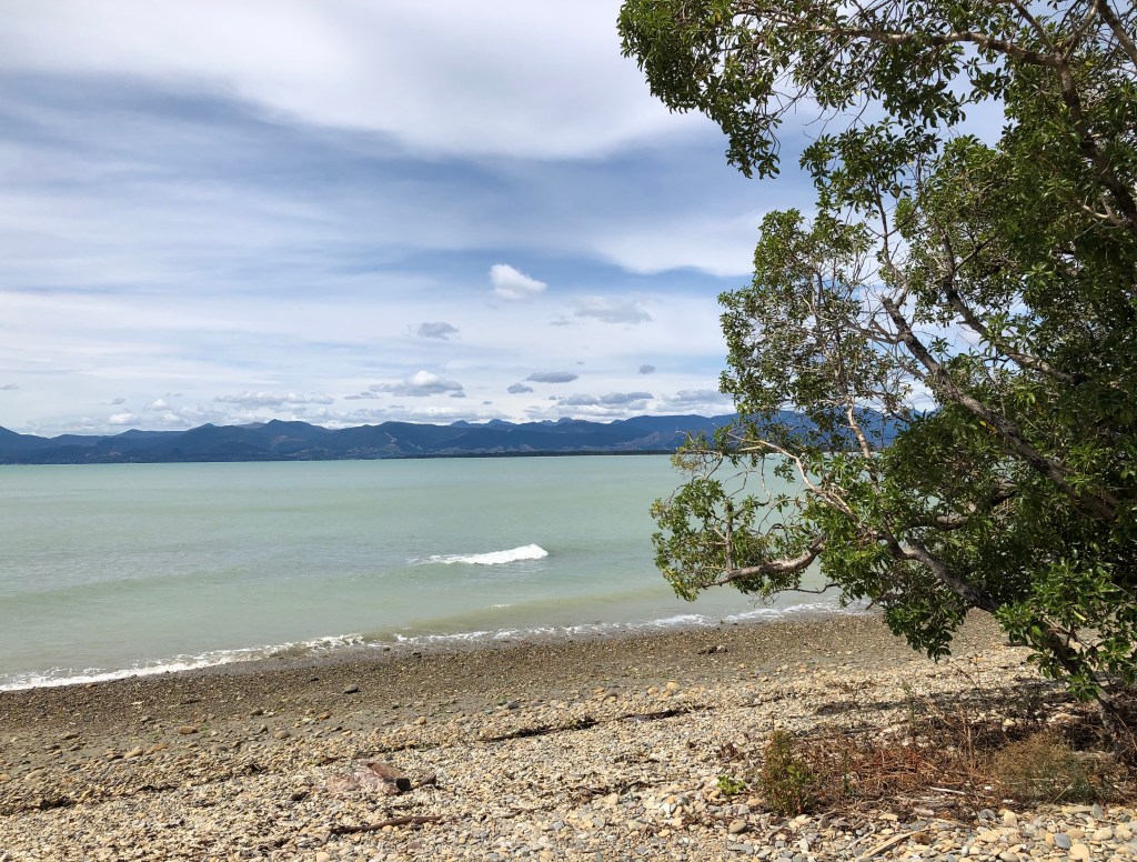 As I mentioned in the last post (Making the weekend shine…with a bit of rain…or a short trip to Nelson Part 1) Saturday was a lovely sunny day, and after lunch in Mapua, we drove up the coast, stopping first at Ruby Bay to admire the view and, of course, take photographs. I love the way the hills in the background are so blue.