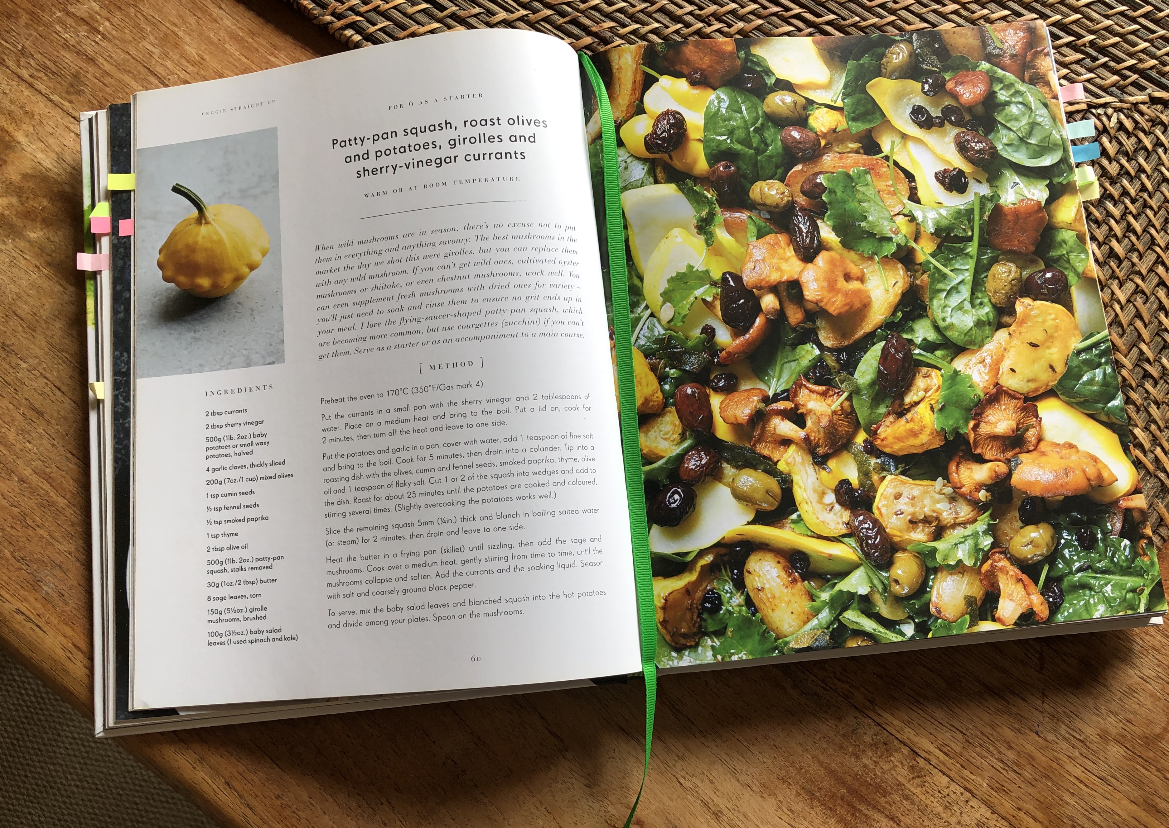 I lost my appetite last week, and to tempt myself by adding in new tastes, I made this potato and scallopini (patty pan squash) dish from Peter Gordon’s most recent book. It was full of flavour – smoked paprika, olives, mushrooms, raisins and garlic – and was indeed rather good. You can see the photo in the book and my version below.