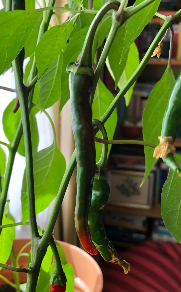 I am sitting working at home surrounded by my chilli plants, and have been monitoring them each day. Below you can see what one of them looked like on Wednesday, and two days later on Friday. I have become well acquainted with each chilli on each plant as I contemplate the work before me!