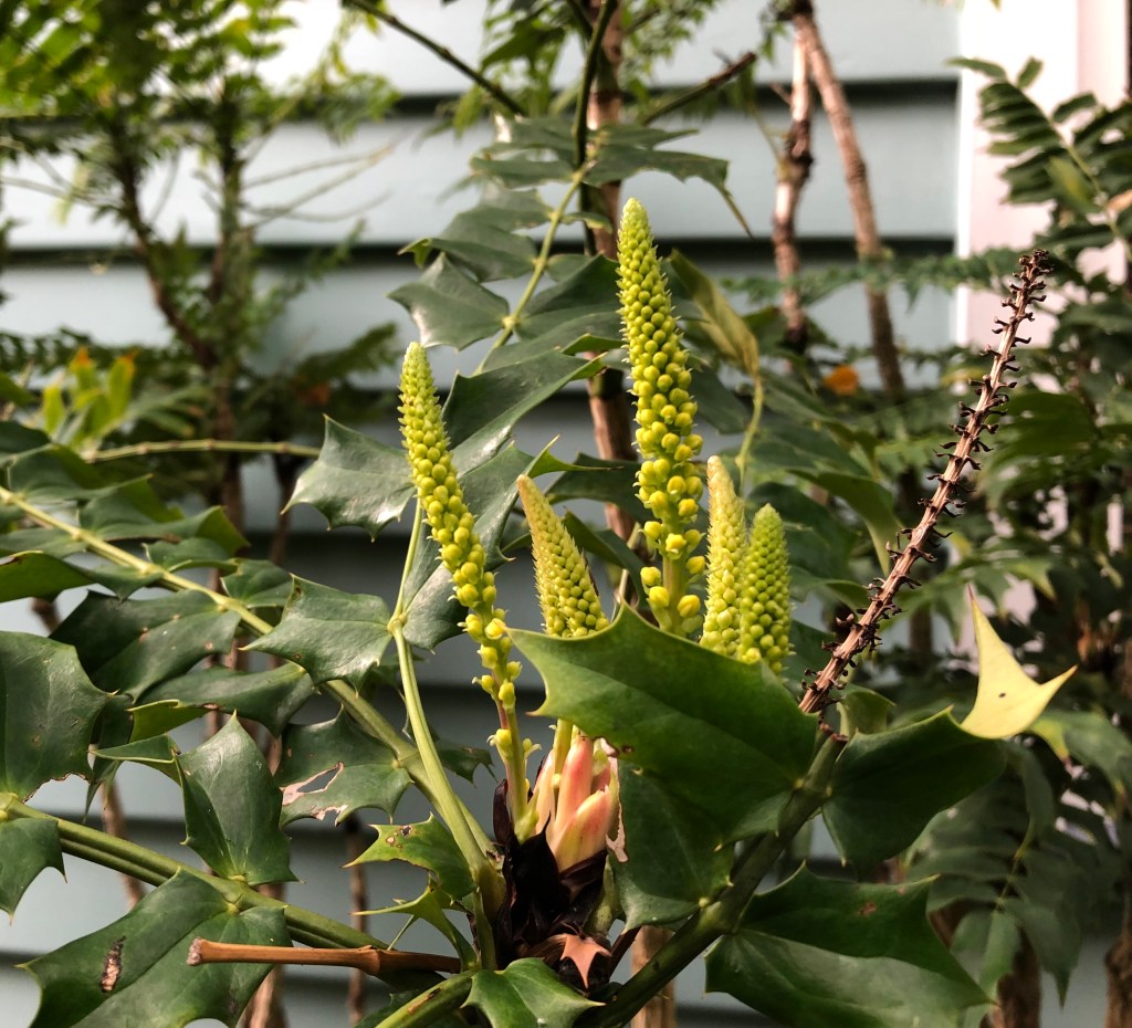 Over at the side of the house, the mahonia plants are flowering. It was a bit tricky to get a decent picture do to awkward angles, but at least you get the idea. The plant on the left was easy to photograph, hence the picture.
