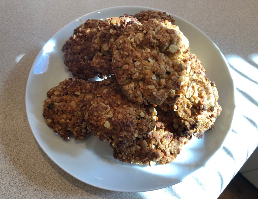 Sticking with food for now, I naturally made Anzac biscuits* on Saturday. Built around that excellent combination or rolled oats and desiccated coconut, it is claimed that these biscuits were sent to the Anzac troops (ie Australia New Zealand Army Corps) in World War 1. However, this has since been disclaimed, with the story that the biscuits were sold to raise funds back in New Zealand and Australia. The history doesn’t matter: these biscuits are absolutely delicious and at least two need to be eaten at one sitting. The Edmond’s recipe can be found here.
