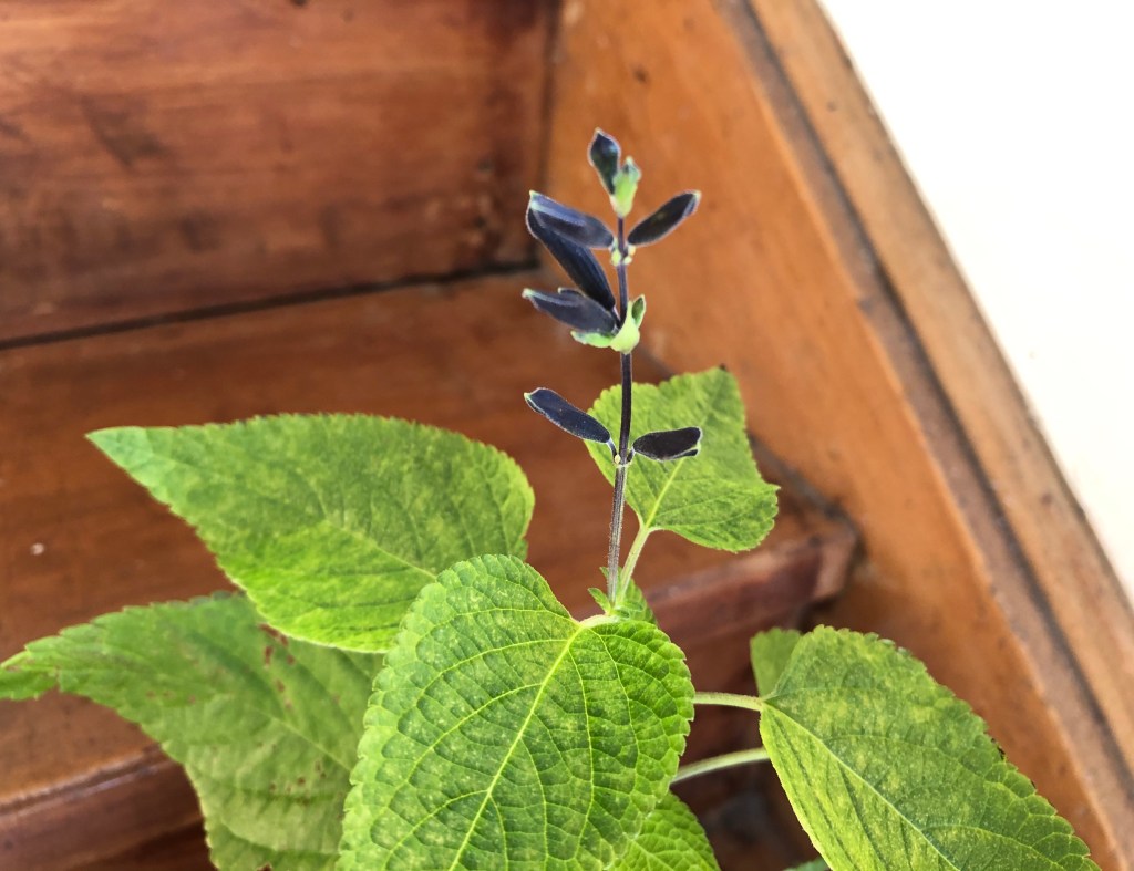 The day began sunny, if a little windy, so I had to pop the salvia on the step to get a picture of the plant remaining still. The variety is blue black. And yes I just have one, wee plant, because that is how things work in our yard!