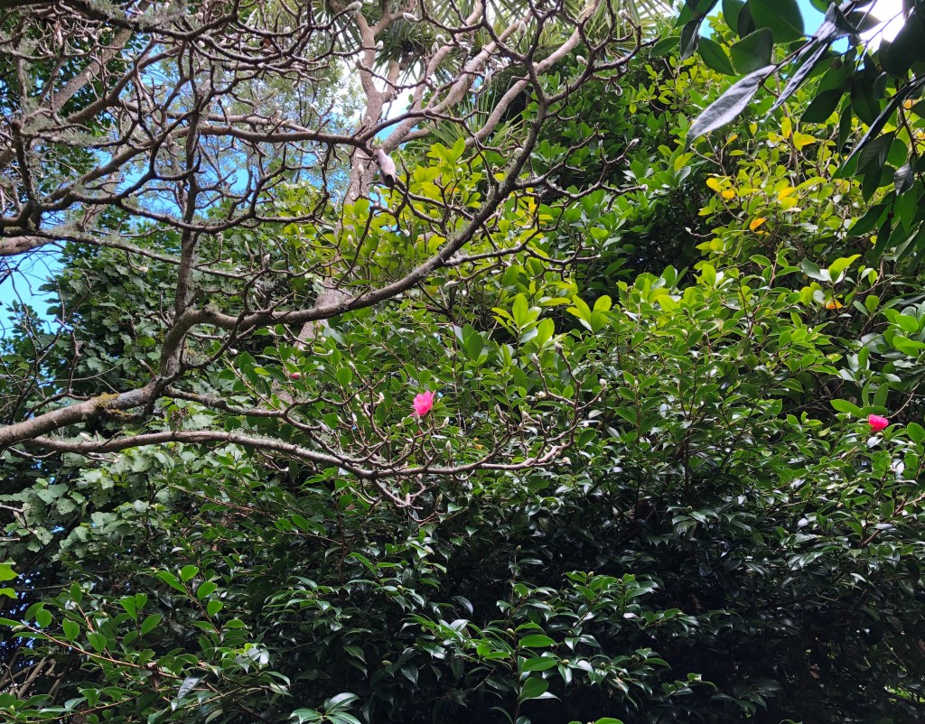 Another update..the pink camellias…the one below is from the steps up to the house, the featured image one is from the front of the house (the top of the bush is just covered in flowers…hence my remark above…), and there is another bush at the back of the house just coming into flower as well (see below). The other bush that has those big, blousy flowers, is still in bud. The tuis love the camellias, and it is lovely to see them poking their beaks into the blooms.