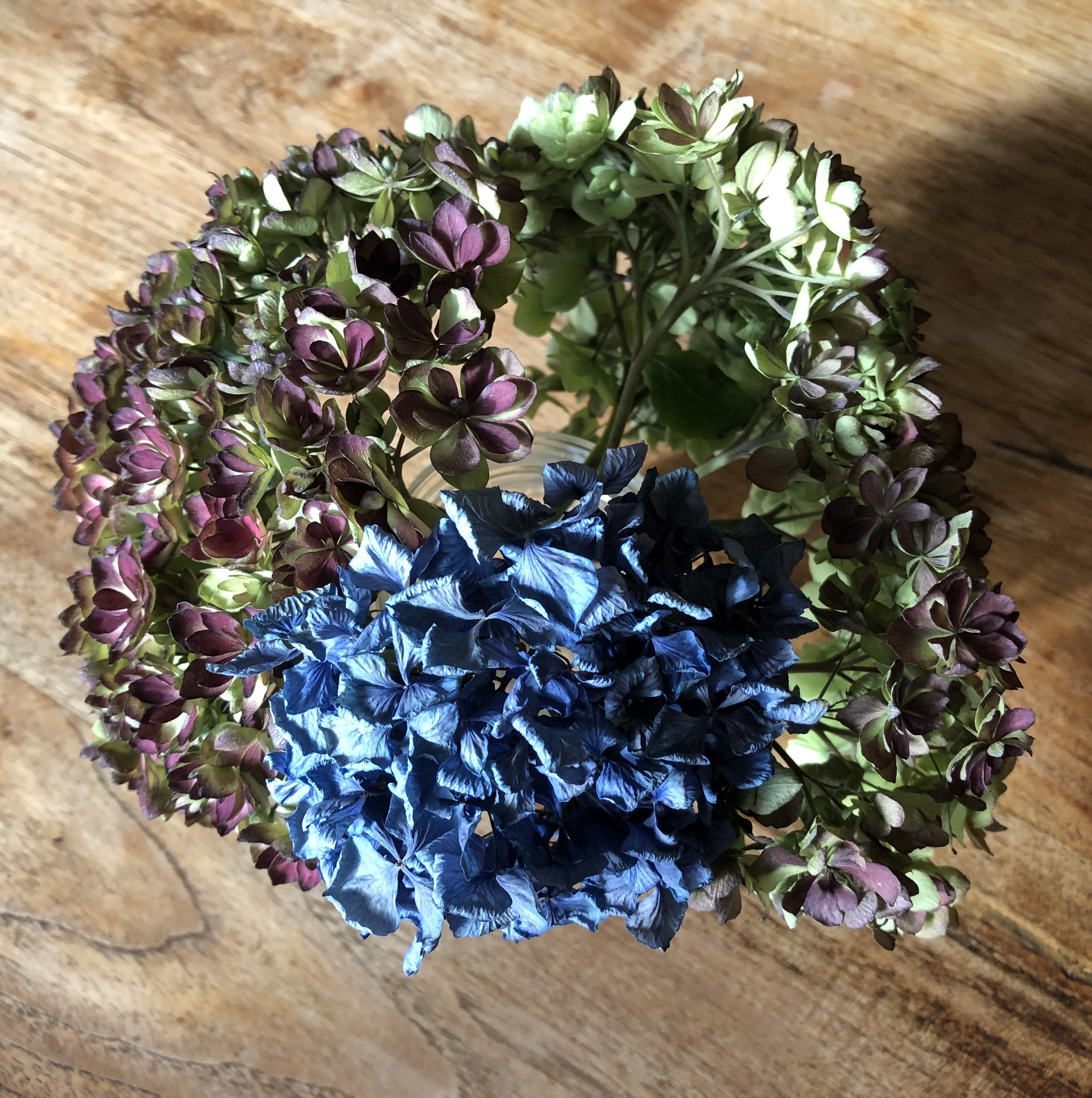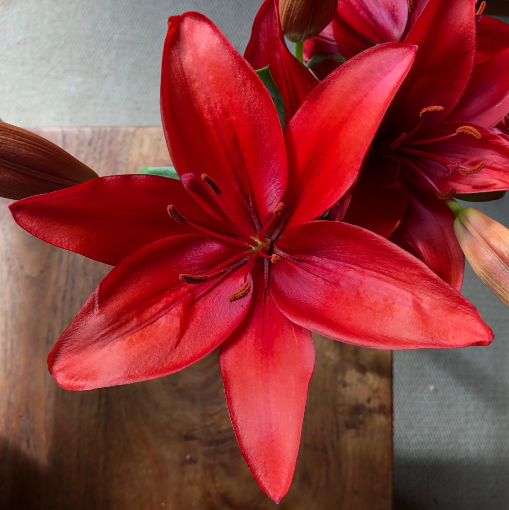 The flowers that our friends brought round last week survived well, and the red lilies are still looking fresh and bright. I managed to dry some hydrangeas from recently purchased bunches of flowers as you can see from the featured image at the top. I am moving them around a bit until I find their perfect spot in our living room.