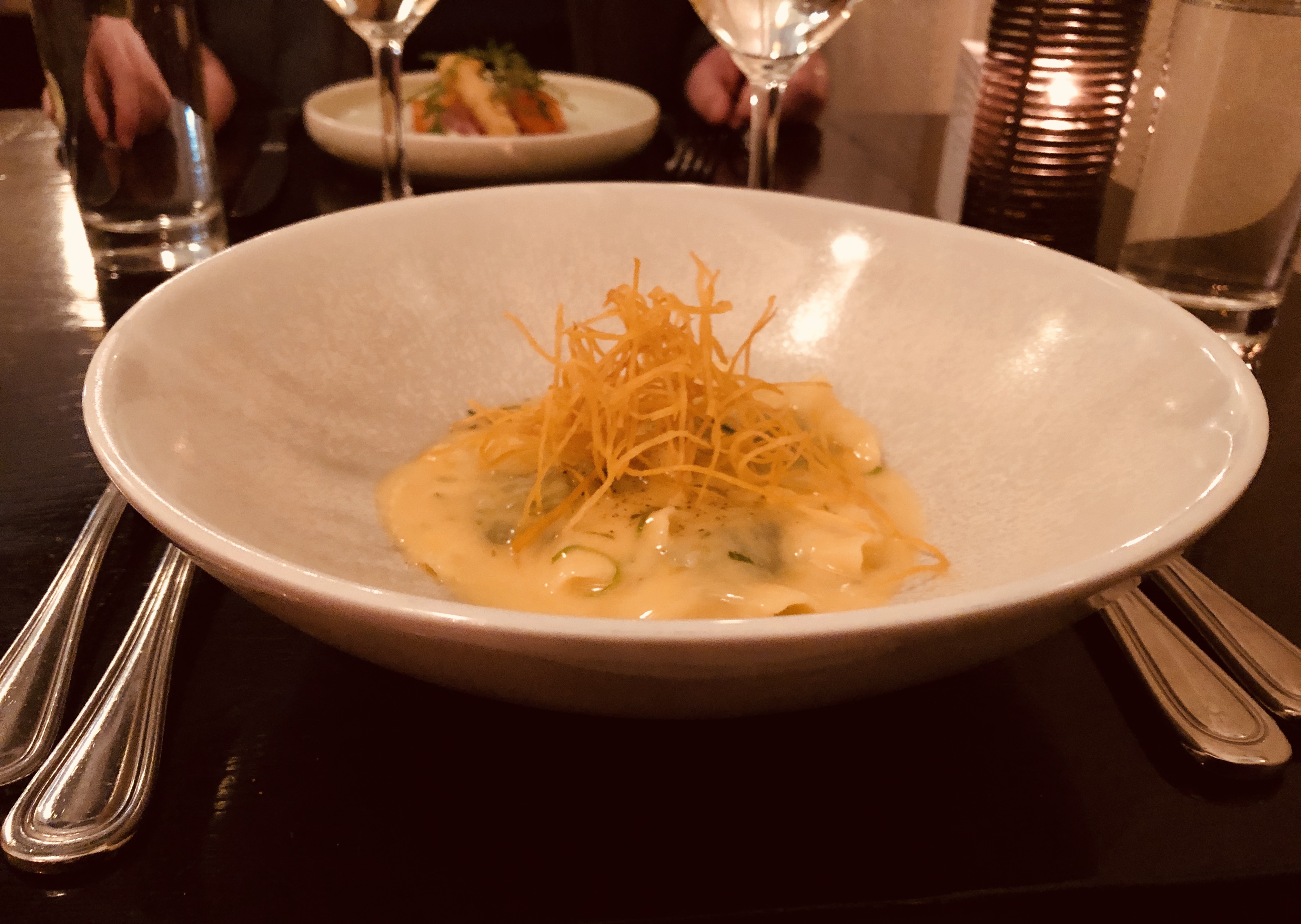 On Friday evening, we went to Logan Brown for dinner, where we enjoyed a three course meal with wine pairings as, after all, it was my birthday. We started with some breads: sour dough and a cranberry and raisin loaf with salted honey butter and black garlic butter. I then had pāua ravioli with coriander, lime beurre blanc, and some lovely crispy kumara (see below) and Karl the goat’s cheese croquettes. We both had the excellent pork belly with cavolo nero, pancetta, a carrot puree and a few slices of pear for contrast, and some roasted Brussels sprouts. For dessert, I had the Sauternes creme caramel, with rum preserved cherries, a lime macaroon and tamarillo jelly. Karl had the hazelnut and ricotta baked cheesecake. The wine matched perfectly, the food was excellent and it was a lovely evening all round.