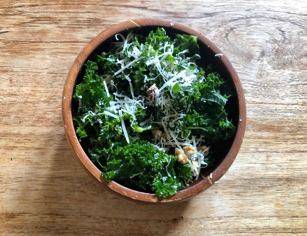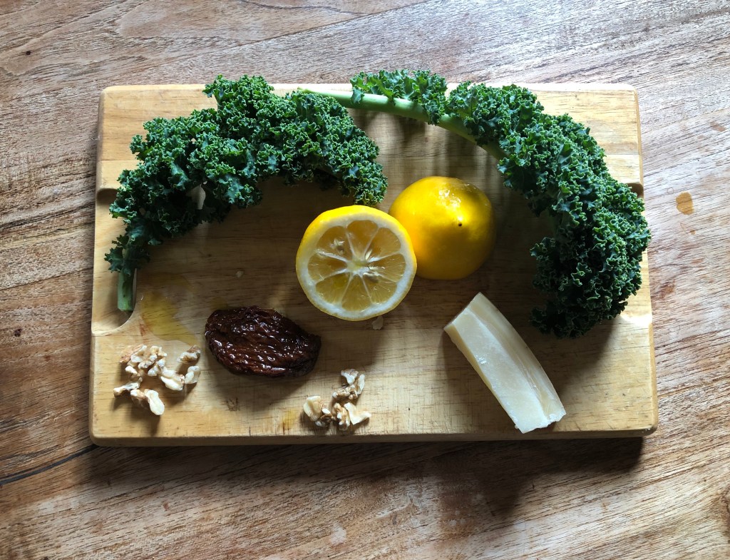 The key to a good kale salad is definitely massaging the leaves. Pull them off the stalk (you can compost them or use in a vegetable stock if you like), throw them in a bowl then massage with salt, lemon and olive oil. Then add the rest of your ingredients – this one has sun dried tomatoes, walnuts and parmesan.