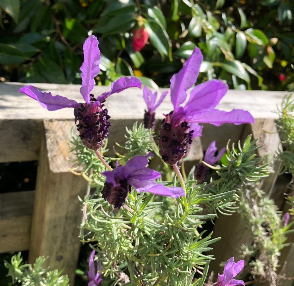 At number three, the lavender. I checked to see if this was in flower this time last year, and it was, so this is definitely a spring variety. Below you can see a bee with pollen sacks enjoying the flowers.
