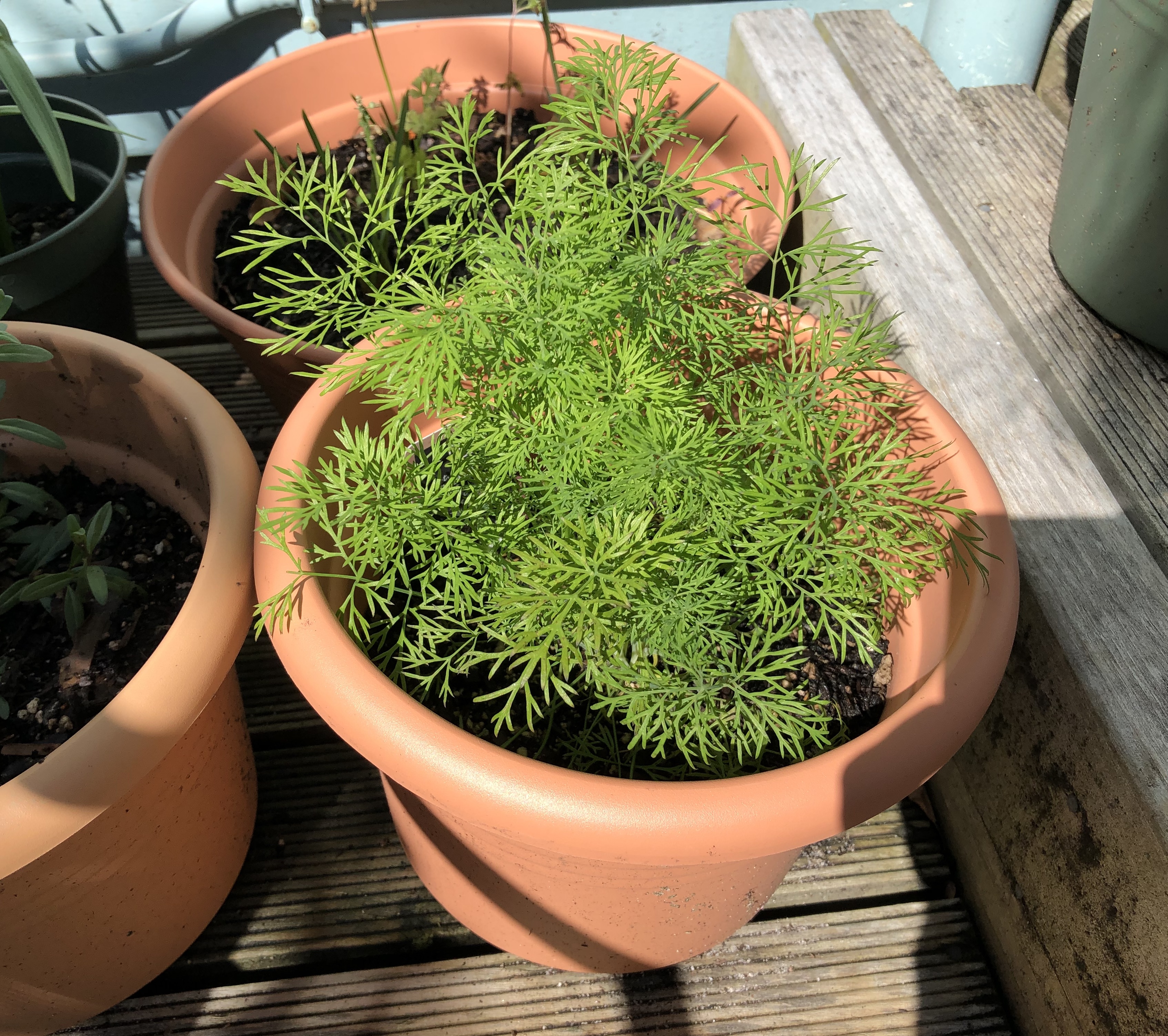 So to the herbs, and thriving dill and curry plants, a sage that needs some tender loving care, a rejuvenated echinacea (new shoots!) and mint and parsley to keep me going. I also have a supermarket basil indoors, which is still reasonably perky. I hope I can keep it going and pot it outside – worth a try anyway.