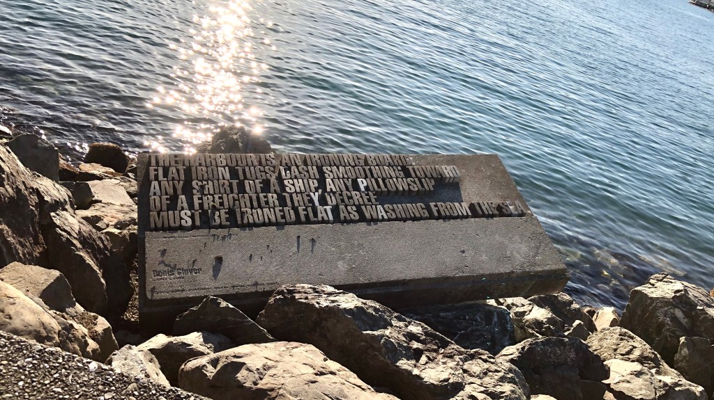 Rather than sit on a bus with a facemask, and because the sun was shining, I walked to Pilates on Saturday morning, enjoying the fresh air and morning light along the waterfront. There will be more pictures on Wednesday, but here is another of the poems which form part of the Wellington Writers Walk.