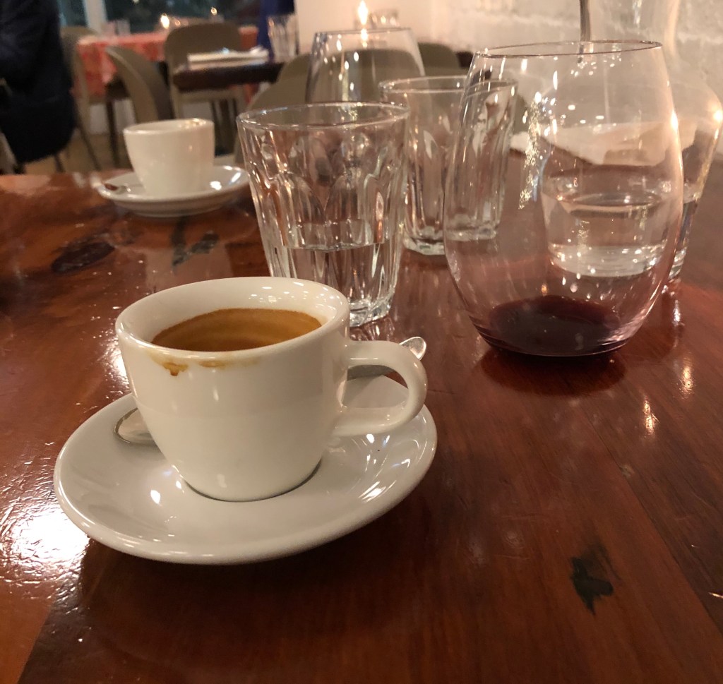 Anyway, let’s start with food and dinner on Thursday at perennial favourite Field & Green. With other events cancelled, this was our treat to ourselves instead. I started with a sherry and a really nicely presented and very tasty smoked eel, apple, hazelnut and celery salad, followed by a butternut squash, maple and thyme tart satin topped with goat cheese and salsa verde. Karl had the twice-baked smoked fish soufflé and the sirloin steak with a celeriac gratin and garlic crisps. We shared a rocket salad topped with thinly sliced pear and Parmesan, and we each had a good glass of merlot. There was no room for dessert, so we just had an espresso before we headed home.