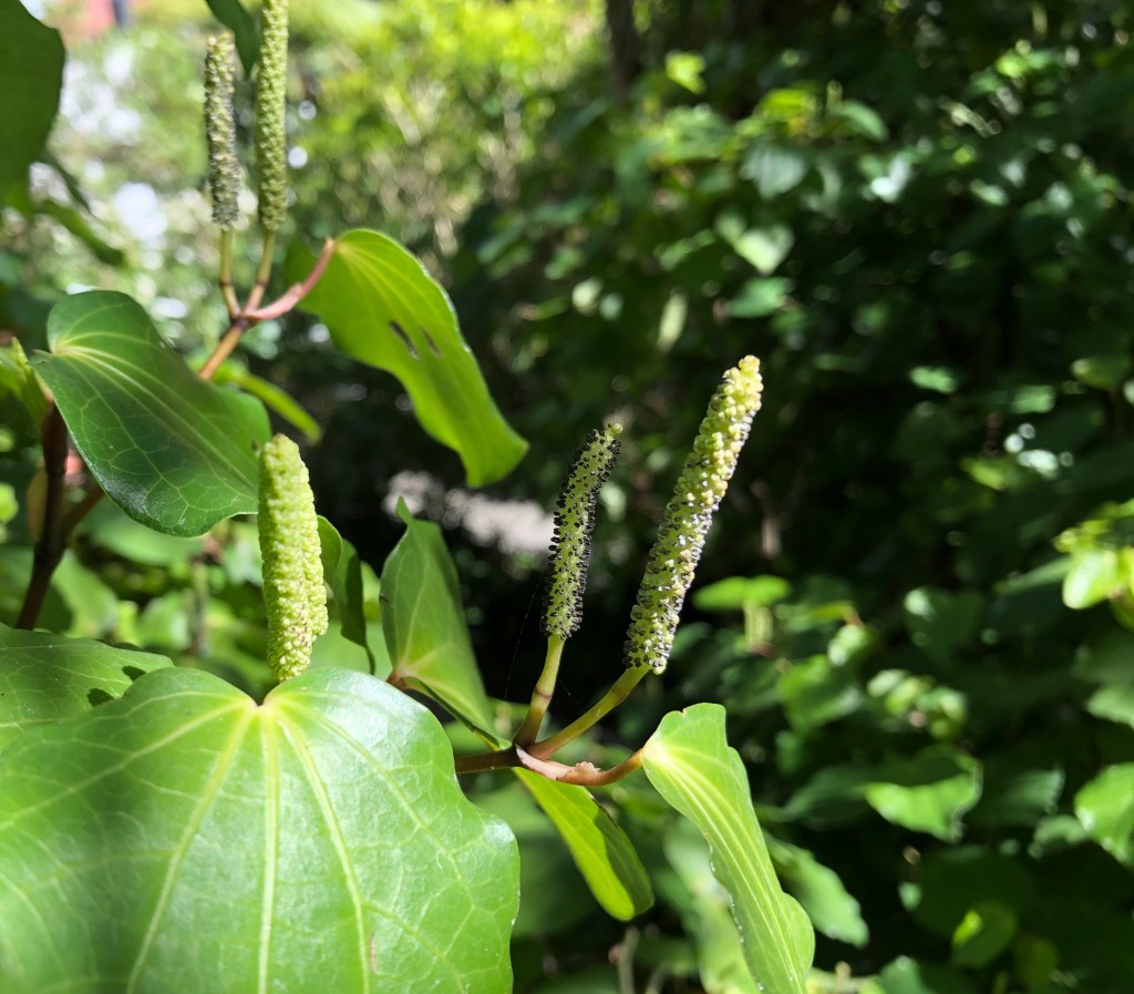 At number five, a New Zealand native, kawakawa. The flowers look like spikes, and in summer, the female flowers ripen to a deep orange. There are lots of bushes around the house, so expect more pictures in the weeks to come.